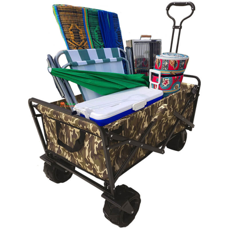 עגלת שטח מתקפלת בעיצוב צבאי מדליק, העגלה עשויה מבד 600D בציפוי PU ובעלת גלגלי שטח איכותיים בגדול “7, כולל כיסוי לשמירת העגלה.