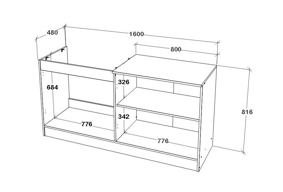 מידות: רוחב 160 ס"מ, גובה 82 ס"מ, עומק 50 ס"מ