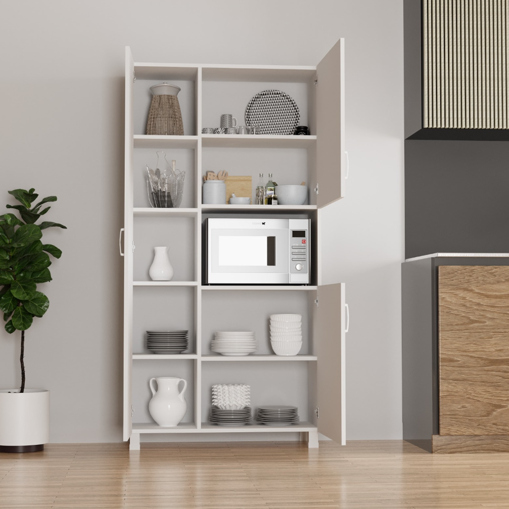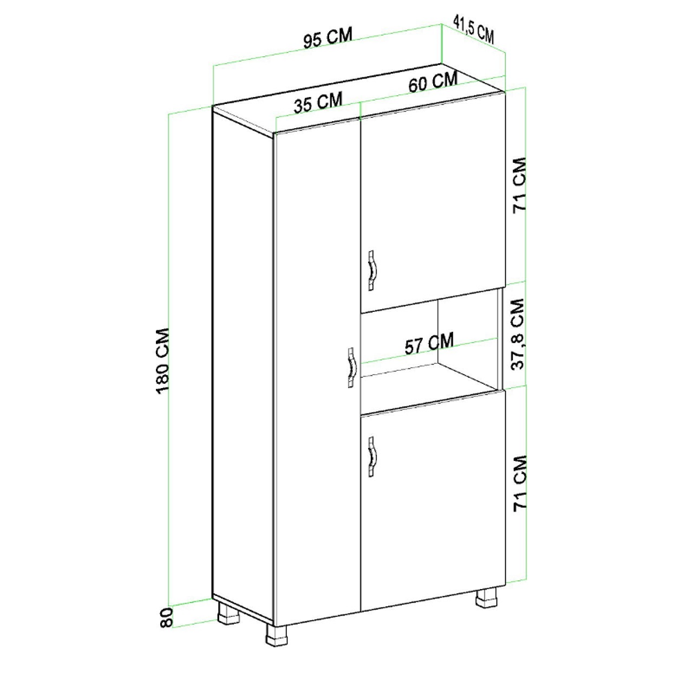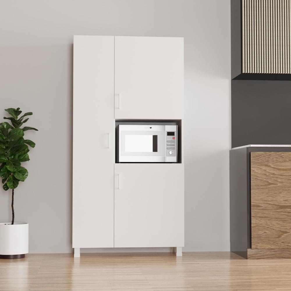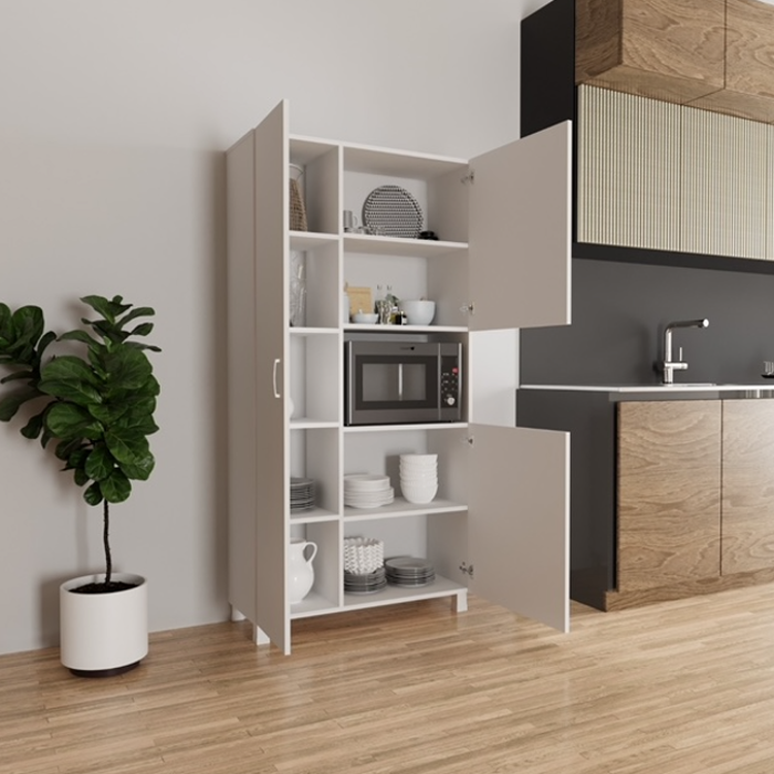 ארון פונקציונלי המיועד לחדרי שירות ולמטבחים, בעל עיצוב אלגנטי וחדשני, כולל מספר תאי אחסון שאחד מהם מותאם במיוחד לשימוש כמקום למכשירי מיקרוגל, מעניק פתרון אחסון וארגון למגוון פריטים שונים.