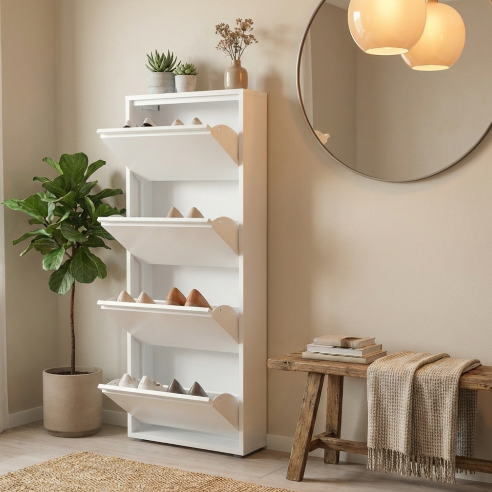 ארון נעליים תלוי בעיצוב דק במיוחד עם עומק של 15 ס"מ בלבד וארבע קומות אחסון, כולל דלתות עם מנגנון סגירה מגנטי. פתרון חכם לניצול חללים צרים בכניסה לבית, במסדרון או בחדר שינה.