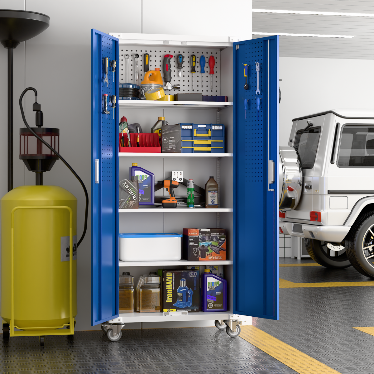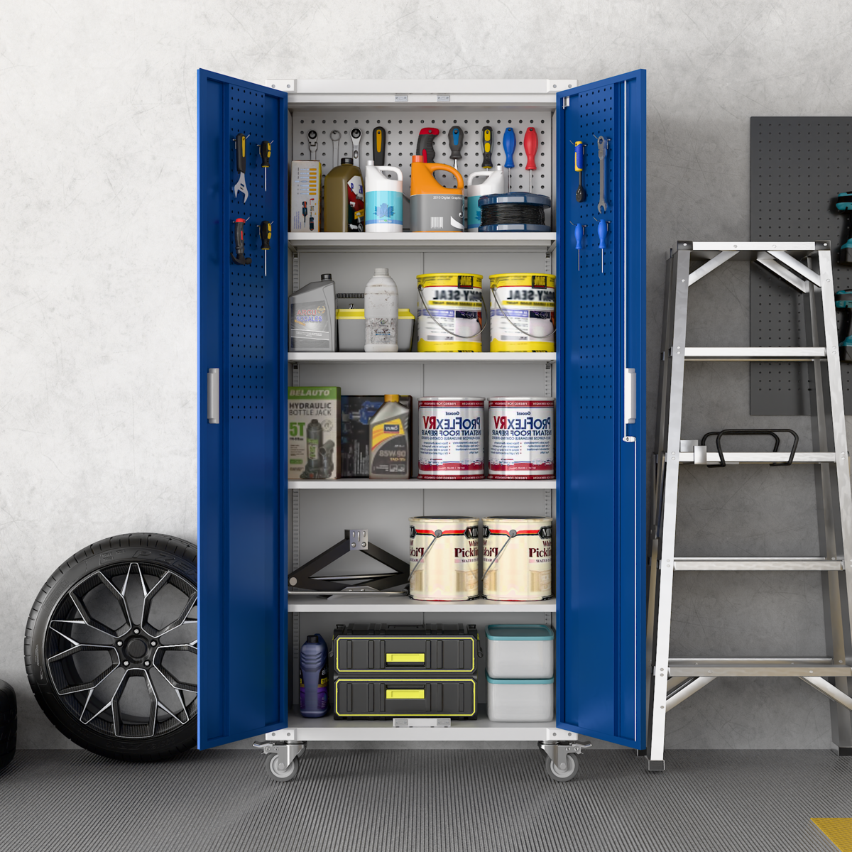 ארון שירות גבוה עם חמישה מדפים פנימיים ודלתות אחסון, כולל גלגלים להזזה נוחה ועיצוב בגוון כחול בשילוב לבן המתאים לבית, למשרד או לחדר שירות.