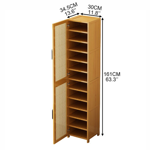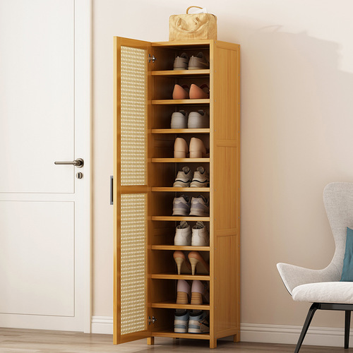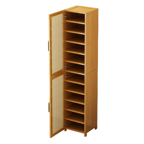 ארונית נעליים מבמבוק בעיצוב קומפקטי עם תאים מרובים לאחסון נוח ומסודר. פתרון פרקטי לניצול יעיל של החלל ושמירה על סדר באזור הכניסה או חדר השינה.