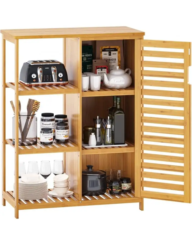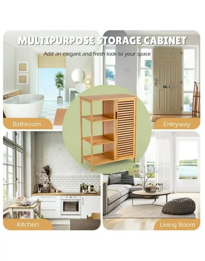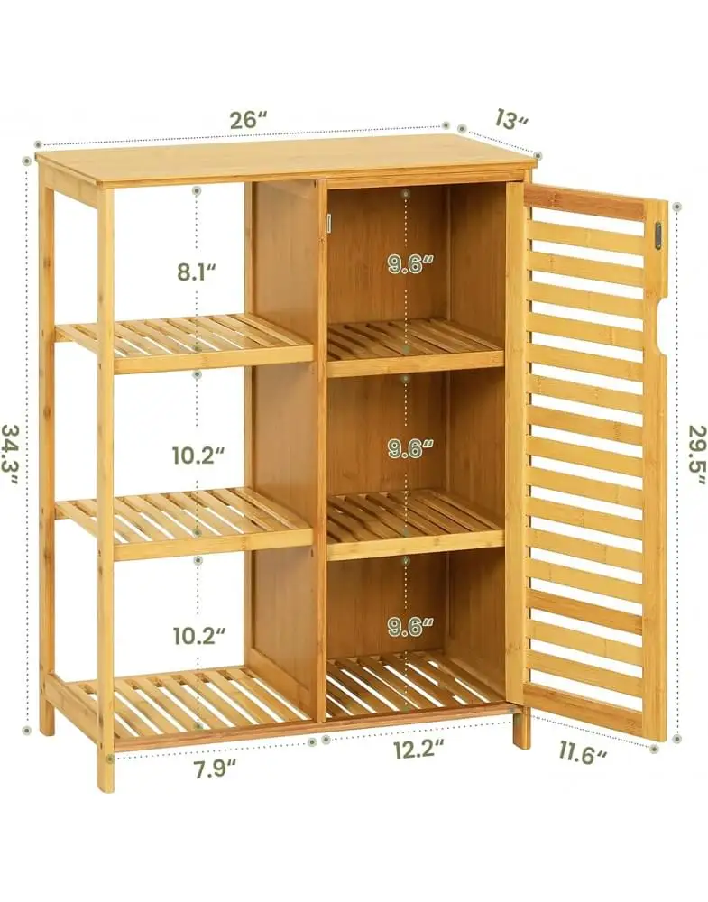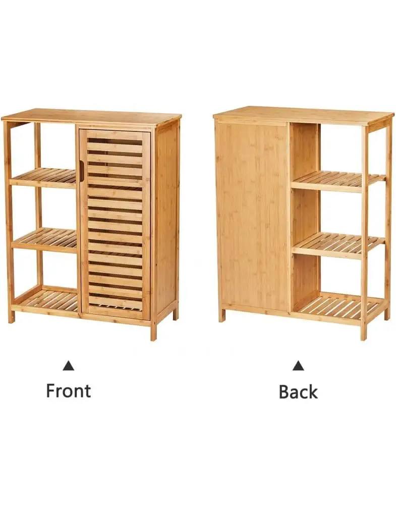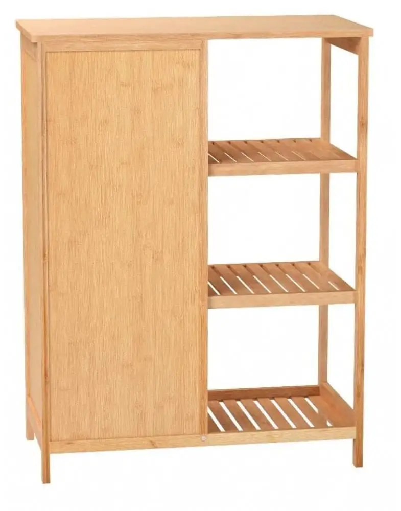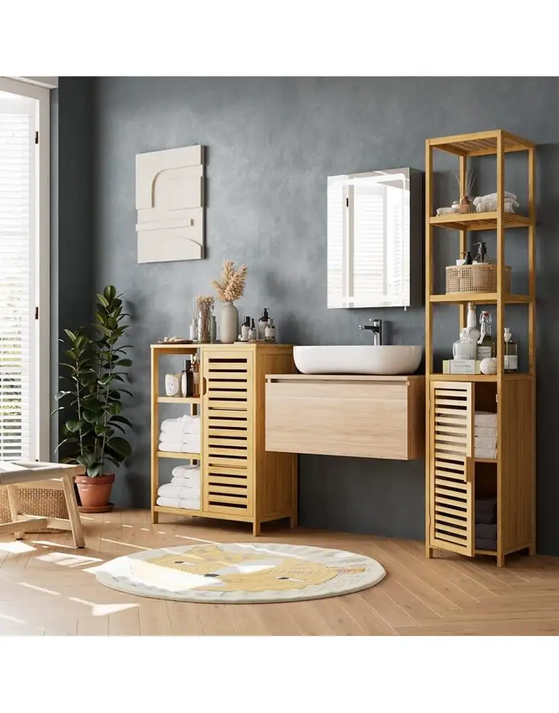 ארונית שירות מבמבוק עם מדפים פתוחים ותא סגור לאחסון נוח ומסודר. פתרון פרקטי לעיצוב חדר האמבטיה תוך ניצול חכם של שטח האחסון.