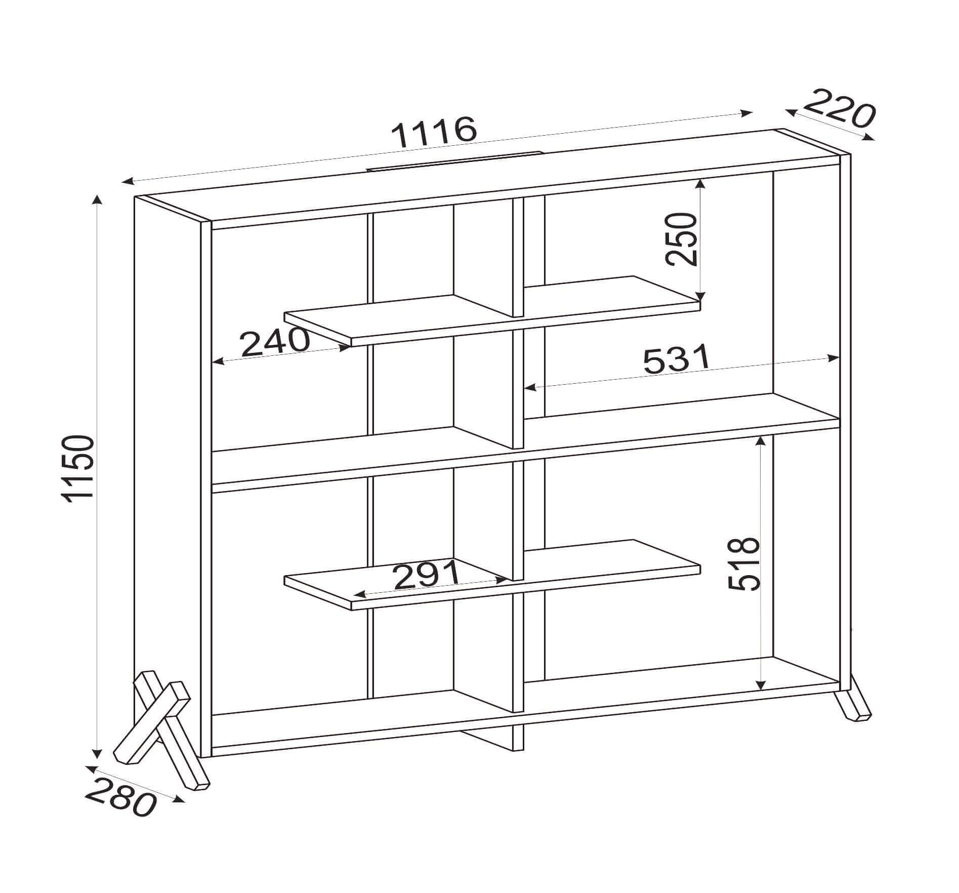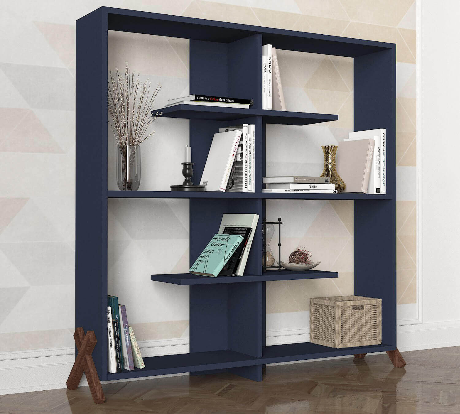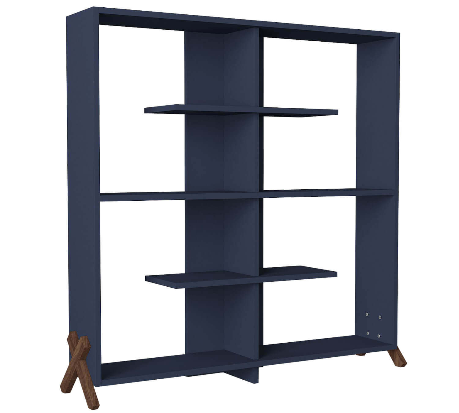 ספרייה בצבע כחול כהה בשילוב רגליים בצורת איקס בצבע אגוז