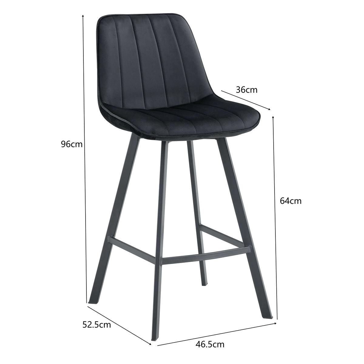 זוג כיסאות בר בעיצוב חדשני וקלאסי, מרופדים בבד קטיפתי נעים למגע, עם רגלי מתכת שחורות. מושלמים לבר, מטבח או פינת אוכל, נוחים וקלים לניקוי.