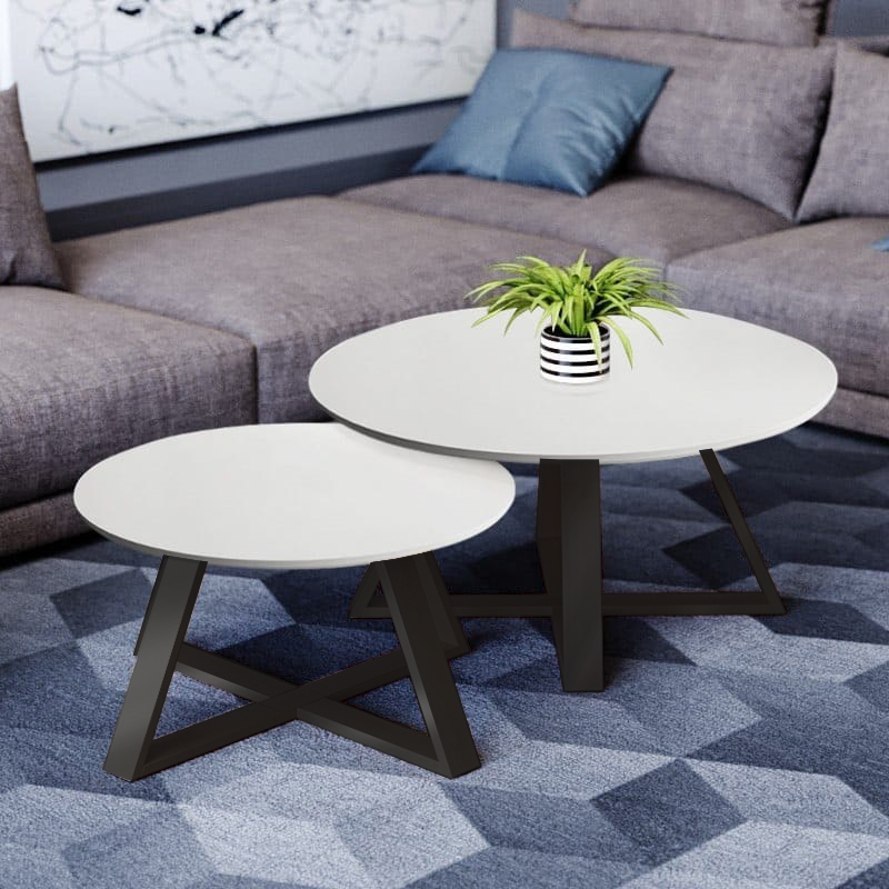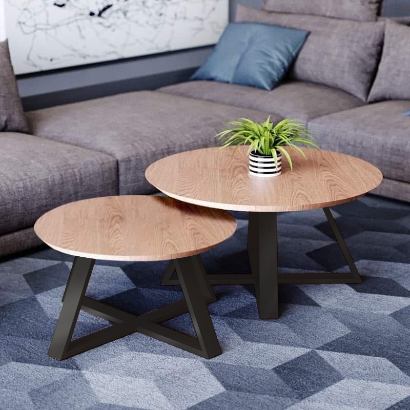 זוג שולחנות עגולים בעיצוב מודרני המשתלבים זה בזה, עשויים עץ איכותי בצביעה בתנור עם רגלי מתכת יציבות. פתרון אלגנטי ופונקציונלי לשדרוג הסלון.