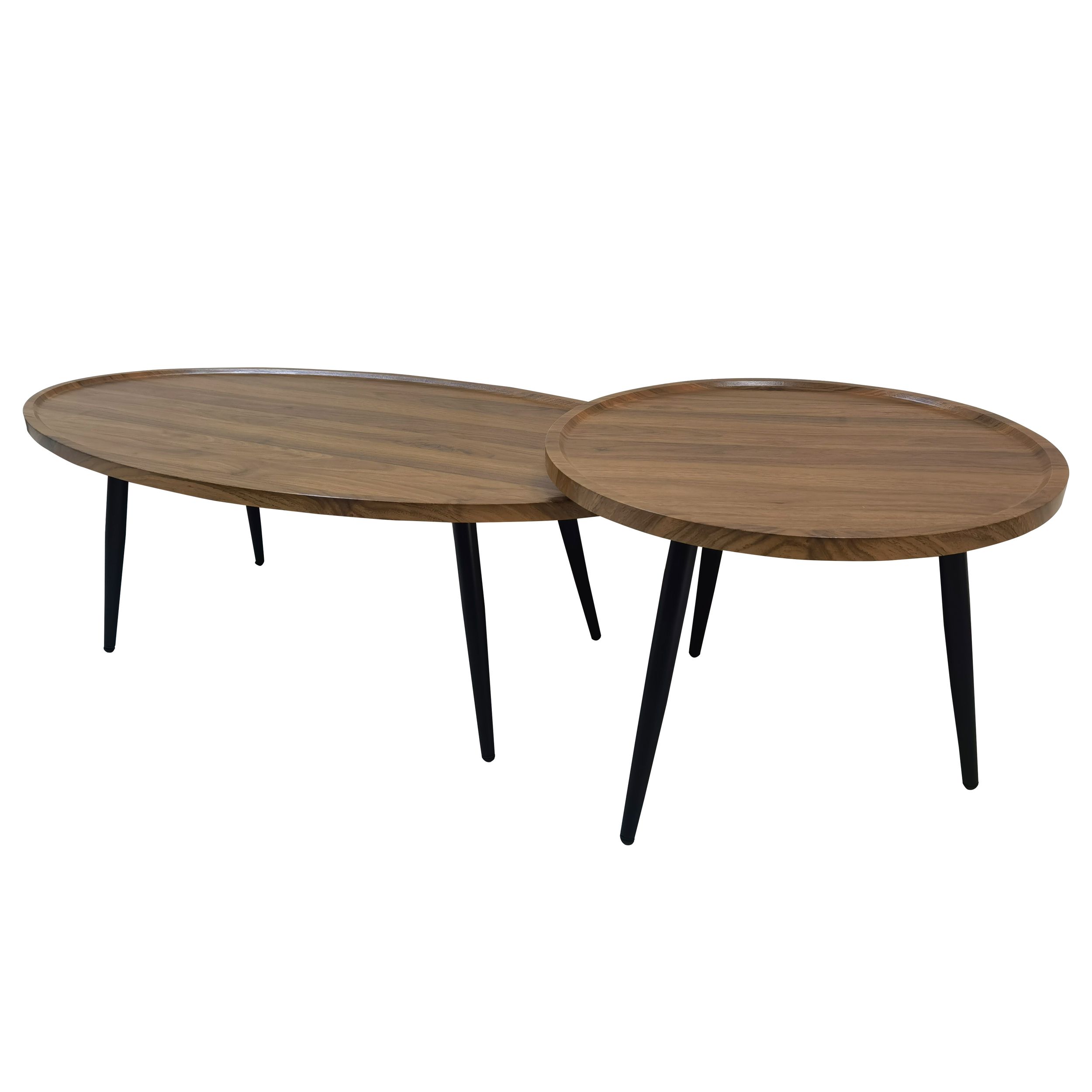 סט שני שולחנות סלון בעיצוב מודרני עם פלטת MDF בגוון אגוז ורגלי מתכת שחורות, כולל שולחן אובלי ושולחן עגול לשימוש גמיש יחד או בנפרד.