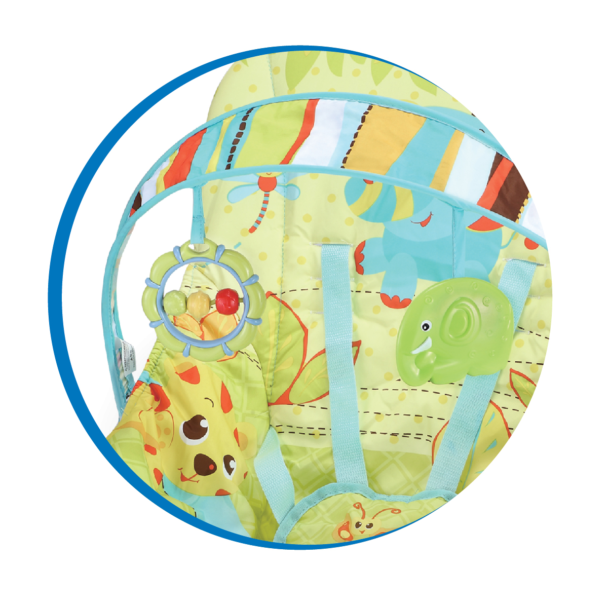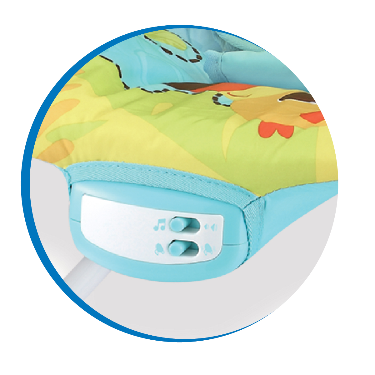 טרמפולינה איכותית המאפשרת שימוש ב-2 מצבים: מצב ישיבה ומצב נדנדה, מושב מתכוונן לנוחות מירבית, יחידת רטט ומוזיקה הכוללת 7 מנגינות שונות להרגעת התינוק.