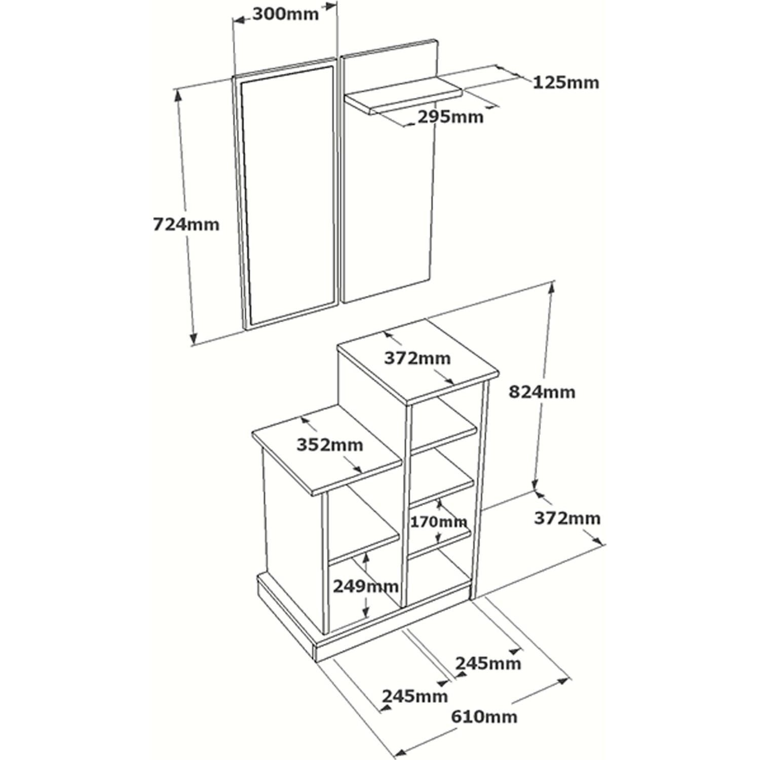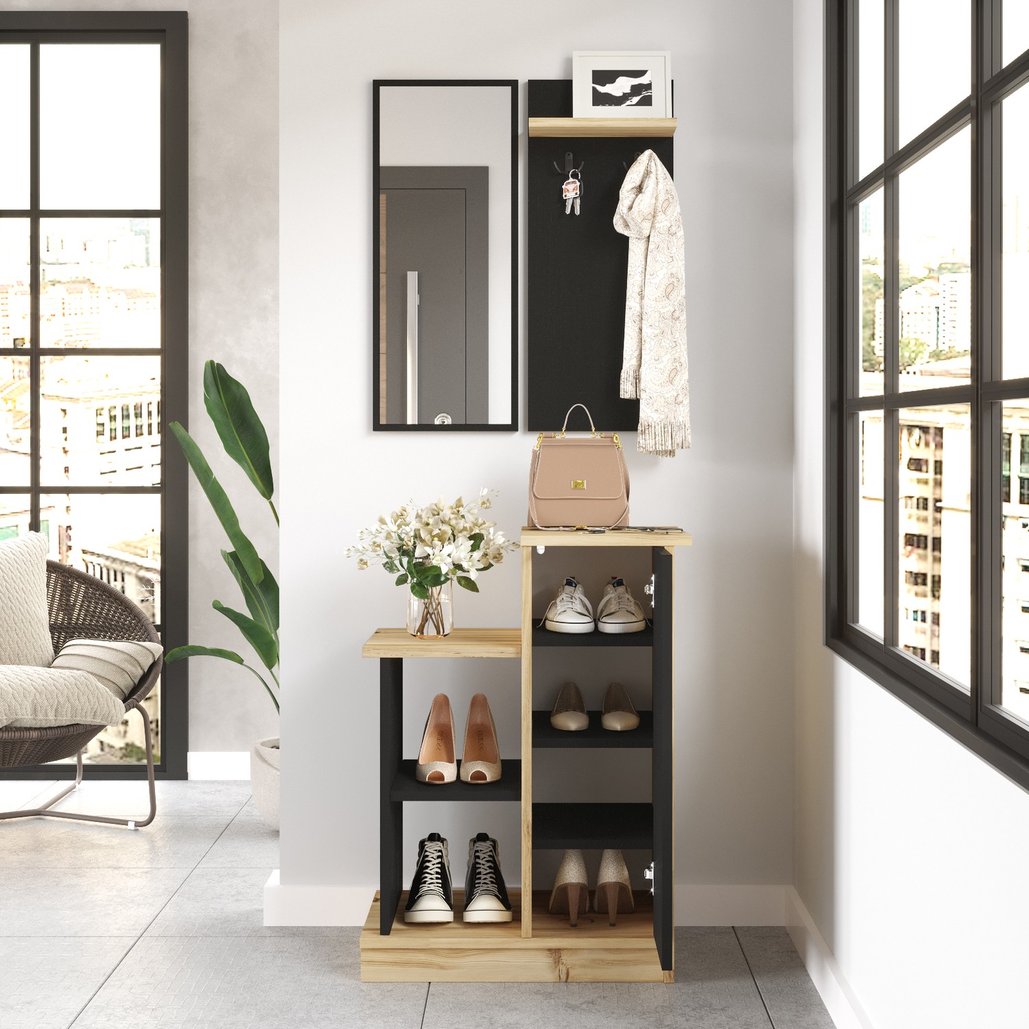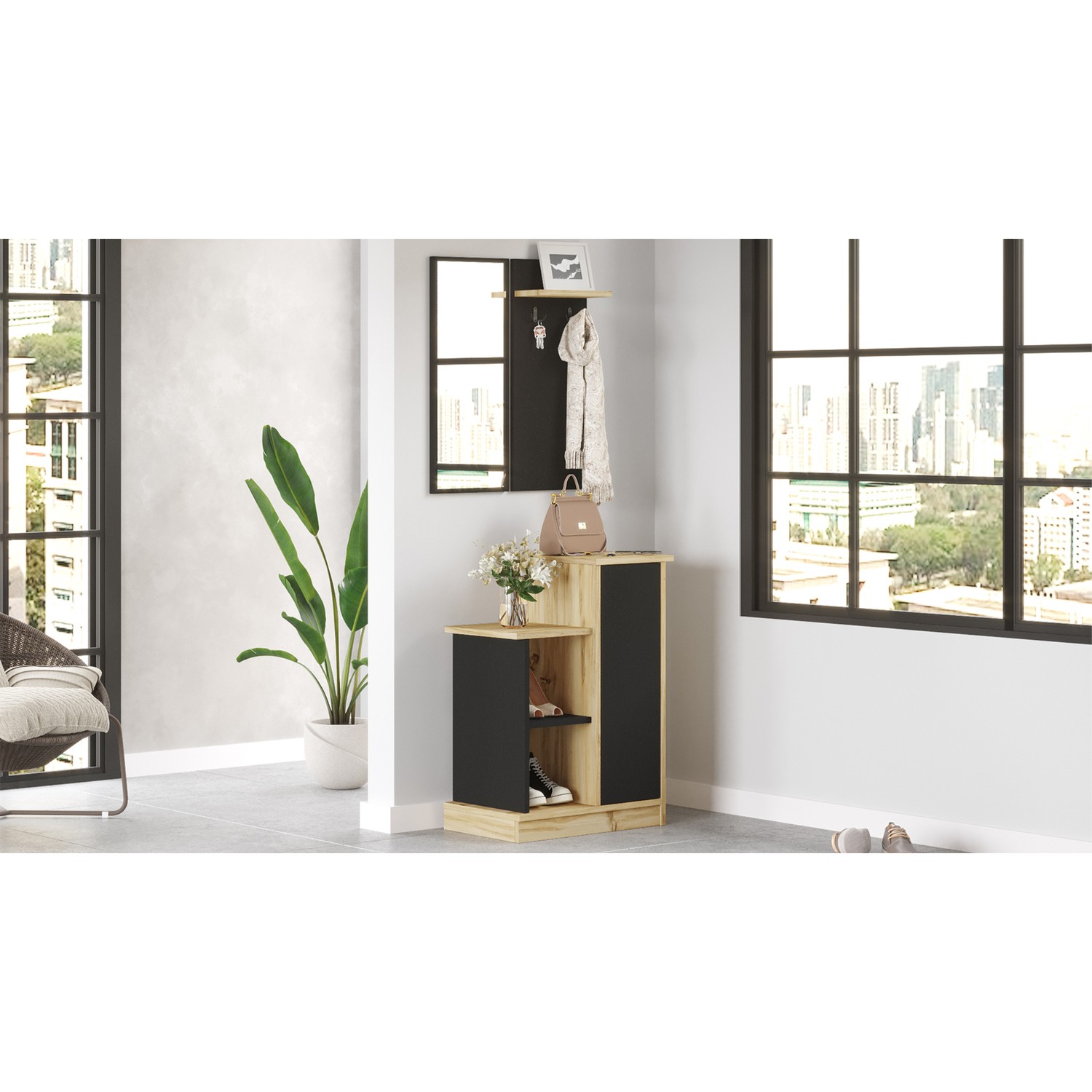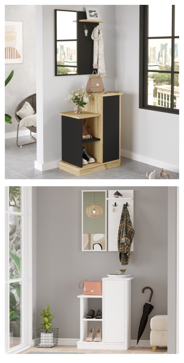 יחידת התארגנות לכניסה לבית או למסדרון, פרקטית ונוחה, בעלת מראת תליה, מדף עם ווים לתליה ויחידת אחסון תחתונה עם 2 מדפים ודלת לאחסון, שימושית לאחסון נעליים ותליית תיקים, מעילים, מפתחות וכד'.