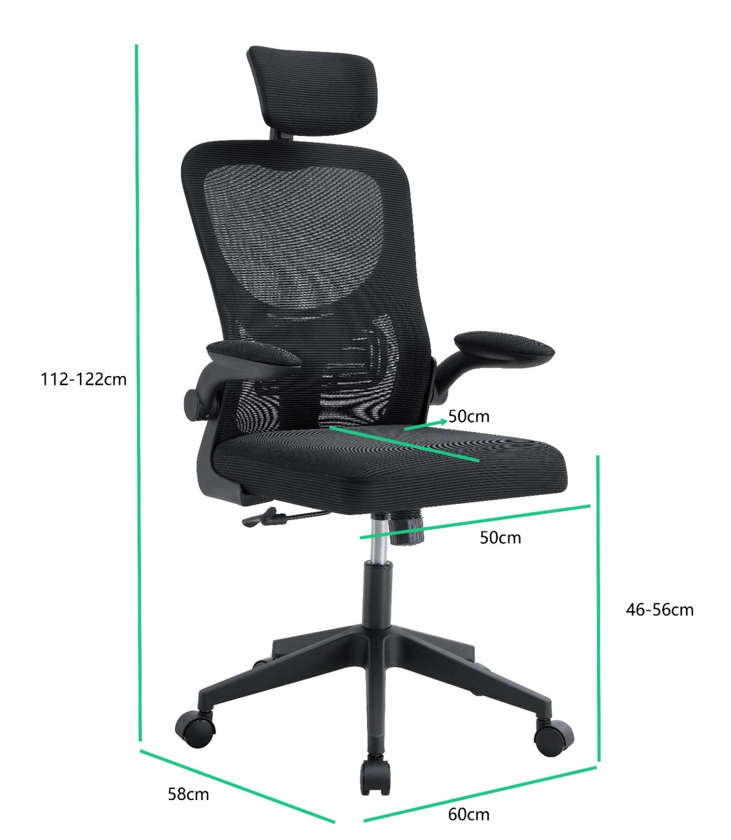 כיסא מחשב אגרונומי עם משענת גב גבוהה, תמיכה מתכווננת לגב התחתון ומשענת ראש מתכווננת. כולל מנגנון נדנוד, ידיות מתרוממות ורשת נושמת לנוחות בישיבה ממושכת.