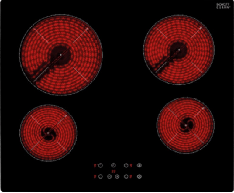 כיריים קרמיות בעלות 4 טבעות חום להתקנה בתוך השיש, T-CLASS עמידה בתקן הישראלי המחמיר גרמניה SCHOTT זכוכית קרמית , הפעלה במגע טאצ’, חיישנים אקוסטיים, טיימר כיבוי לכל אזור בנפרד ונעילה נגד ילדים.