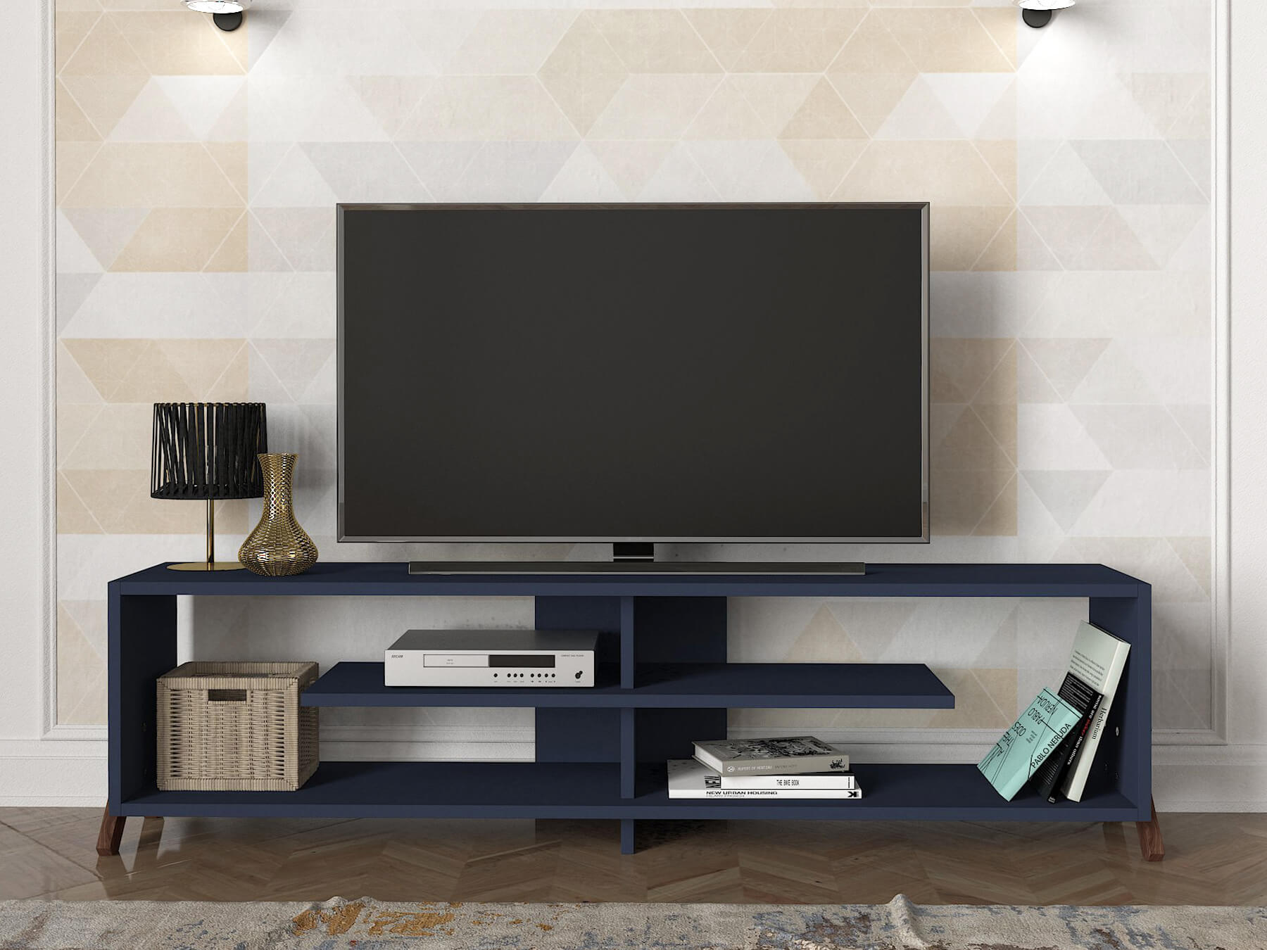 מזנון בצבע כחול כהה בשילוב רגליים בצבע אגוז, בעל עיצוב מרשים, מתאים לטלוויזיה והנחת פרטי נוי לעיצוב חלל החדר ומאפשר מקום אחסון רב ונגיש.