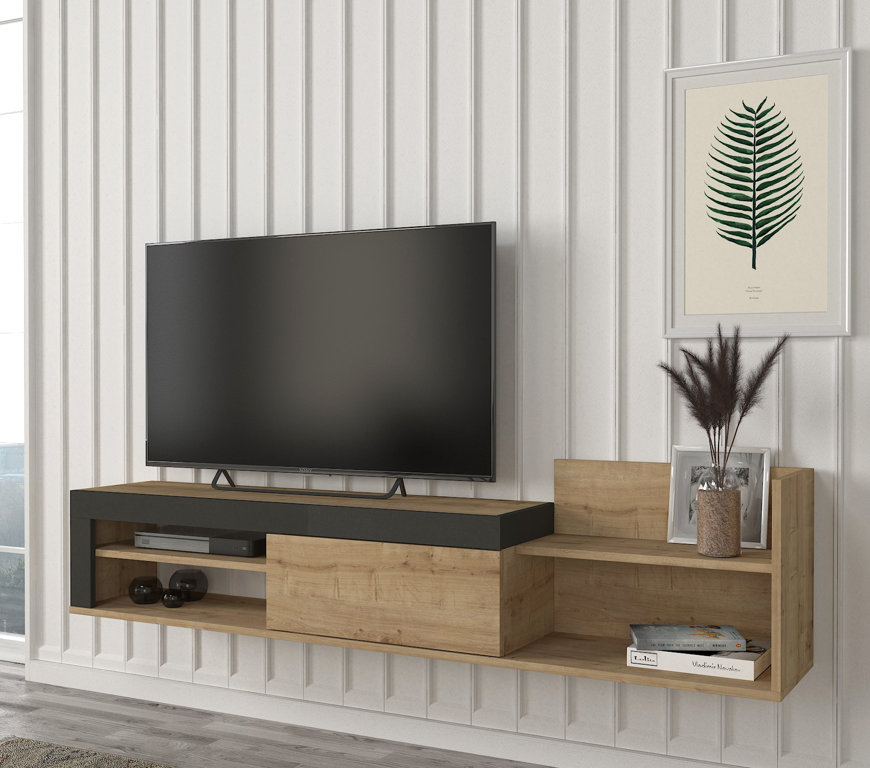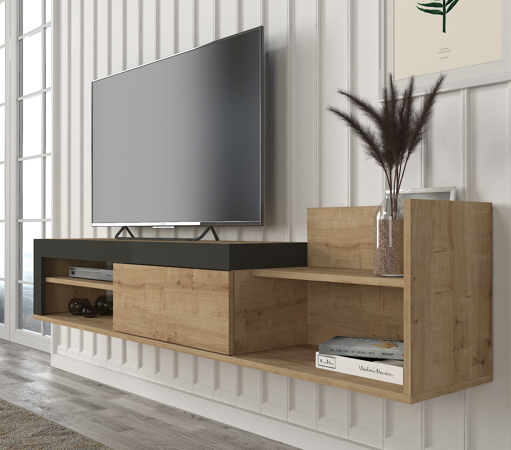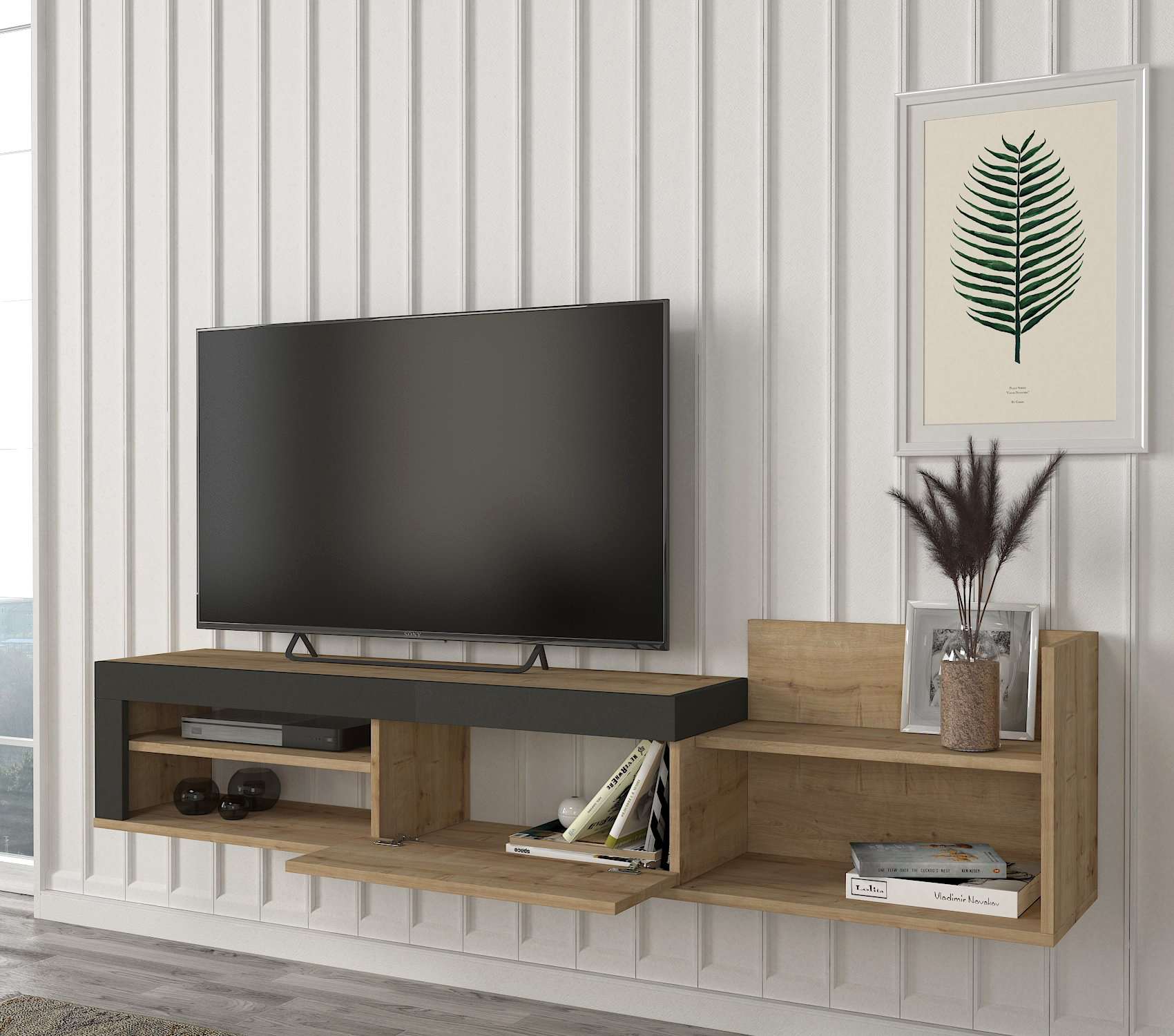 המזנון הינו מזנון צף הממוקם מתחת לטלוויזיה ובעל מקום אחסון רב!