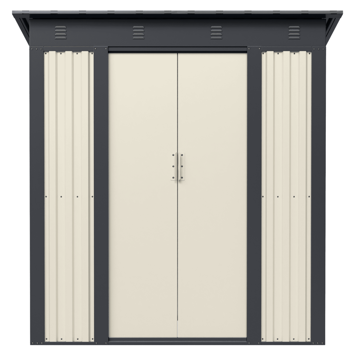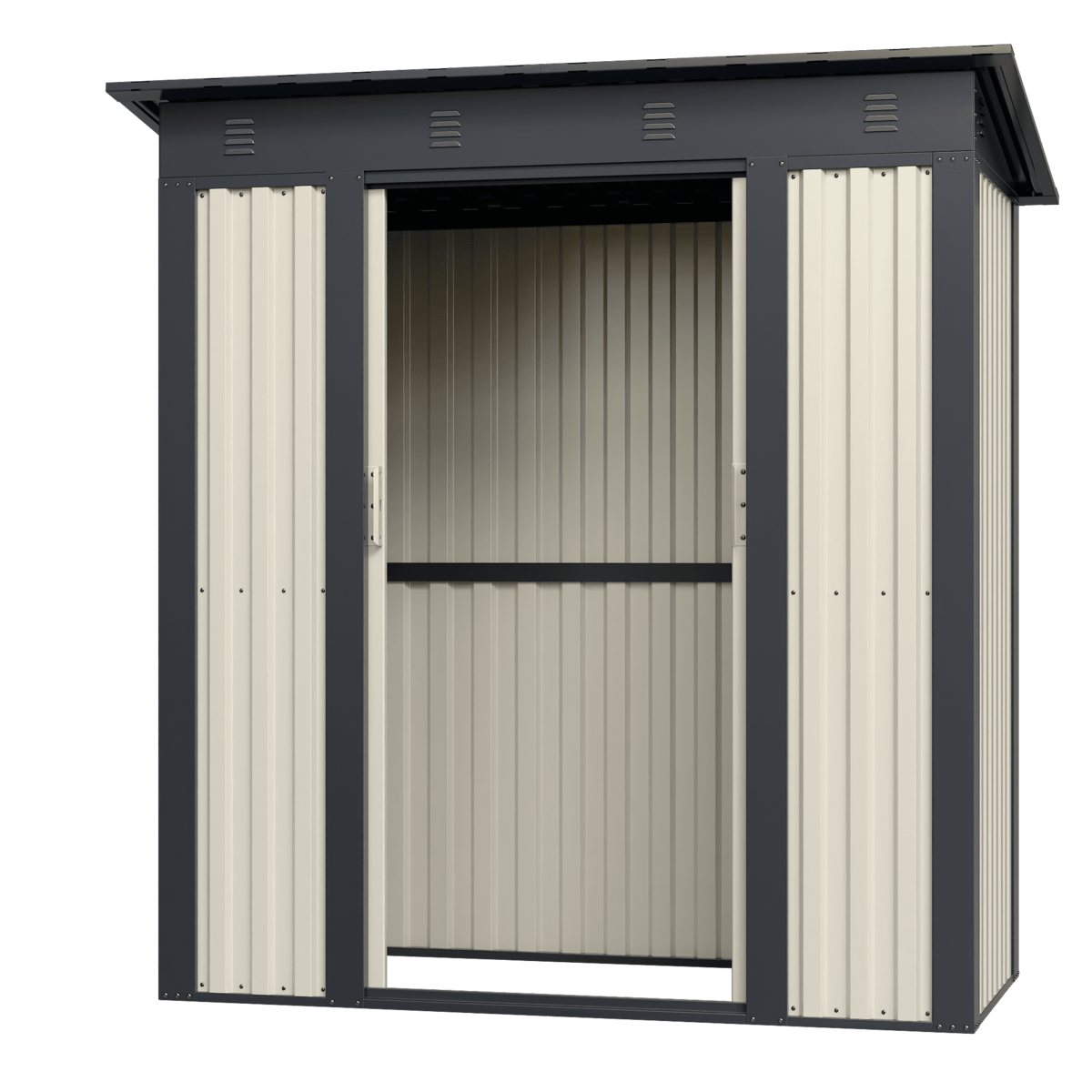 מחסן מתכת לגינה בצבע שמנת בשילוב אפור עם זוג דלתות הזזה ופתחי אוורור, פתרון אחסון עמיד ונוח לציוד גינה, כלי עבודה ואביזרים לחצר או למרפסת.