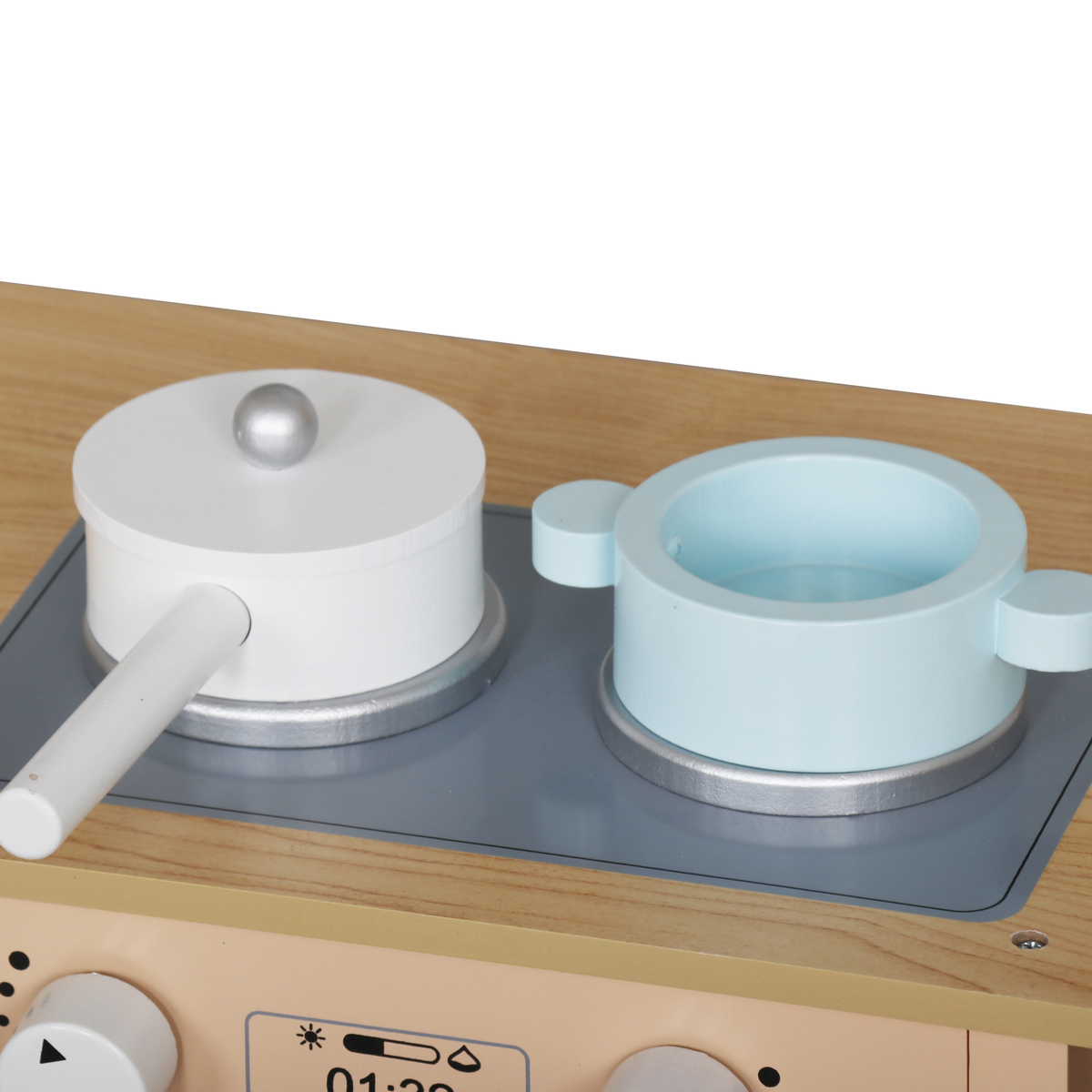 מטבח משחק מעץ בעיצוב מודרני בגווני תכלת ועץ טבעי הכולל כיריים, תנור, מיקרוגל וכיור עם אביזרי משחק. מאפשר לילדים ליהנות ממשחקי דמיון המדמים עולם בישול אמיתי.