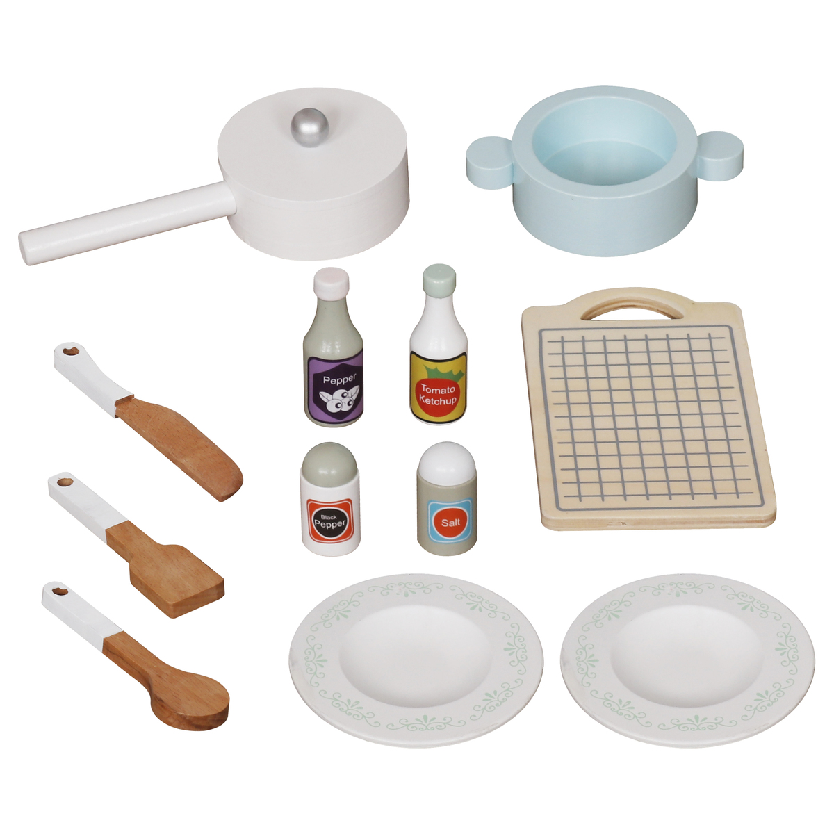 הסט כולל שני סירים, מחבת, קרש חיתוך, כלי בישול, בקבוקי תיבול וצלחות.
