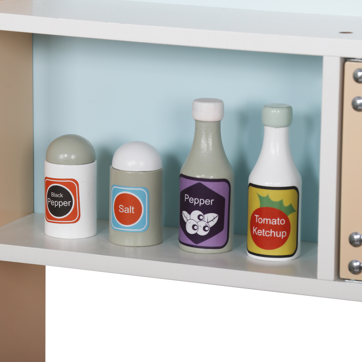 מבנה המטבח עשוי עץ איכותי בצביעה בטוחה לילדים בגווני פסטל רכים.
