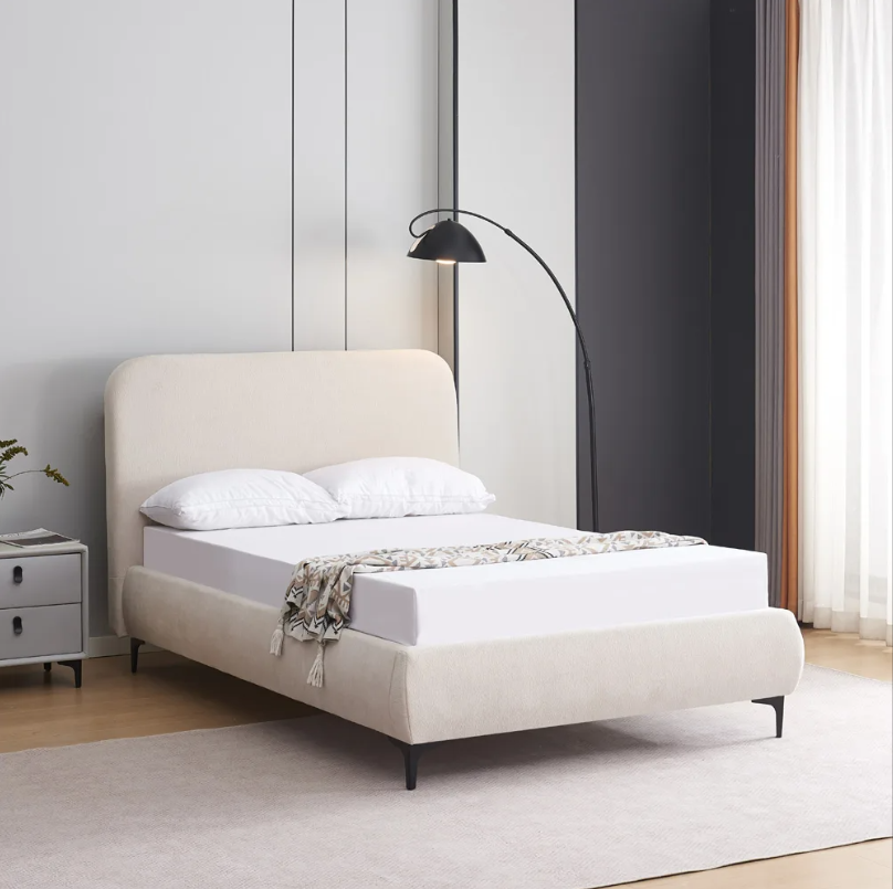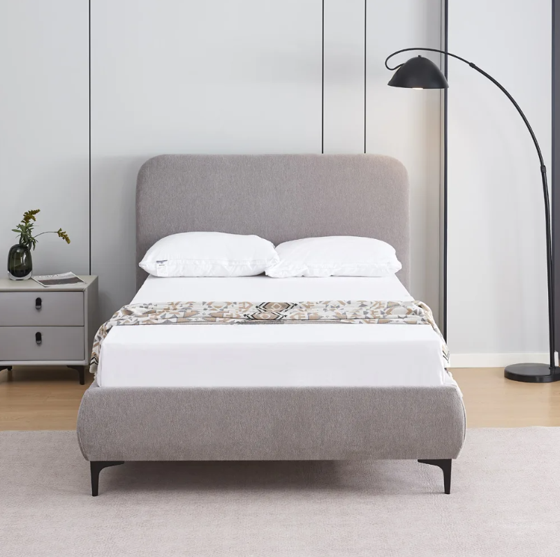 מיטה ברוחב וחצי בעיצוב קלאסי ונקי דגם קורין, מרופדת בד פוליאסטר רחיץ בטקסטורת 3D, עם ראש מיטה חזק, בסיס שלבי עץ מלא ורגלי מתכת גבוהות ליציבות ונוחות מרבית.