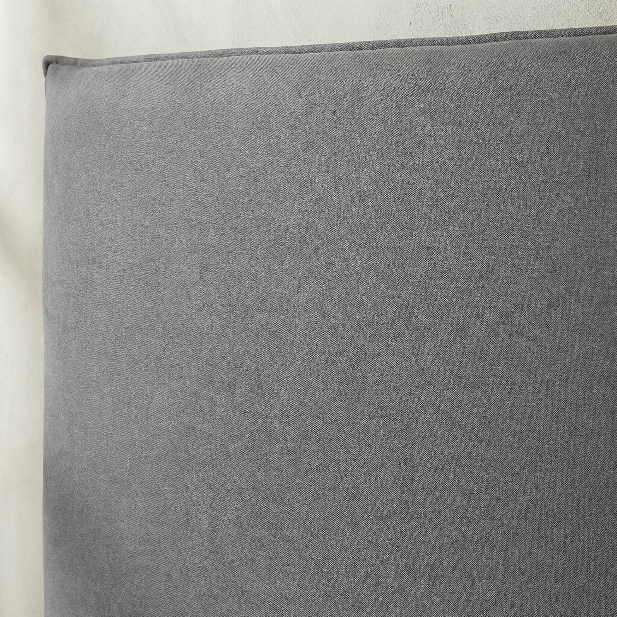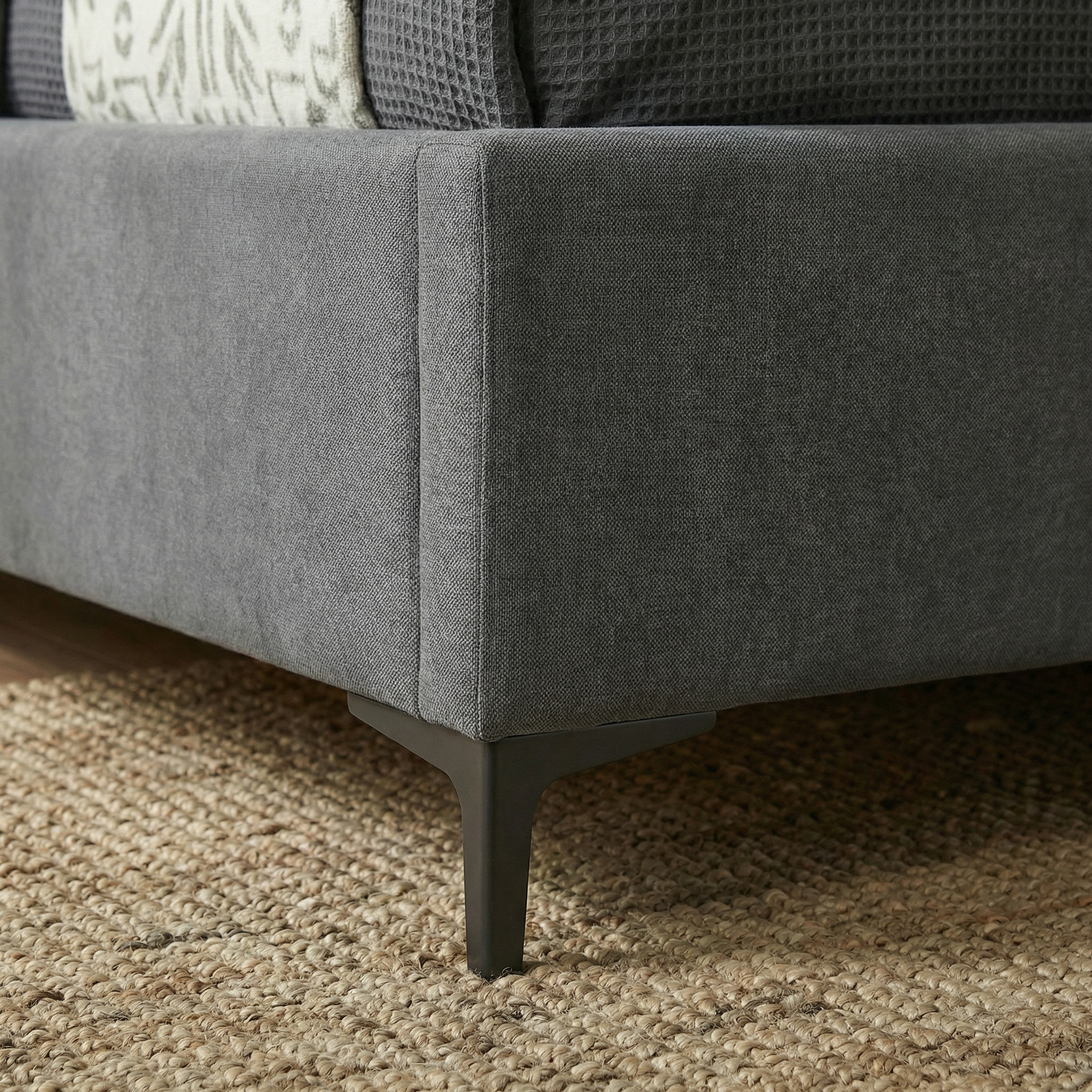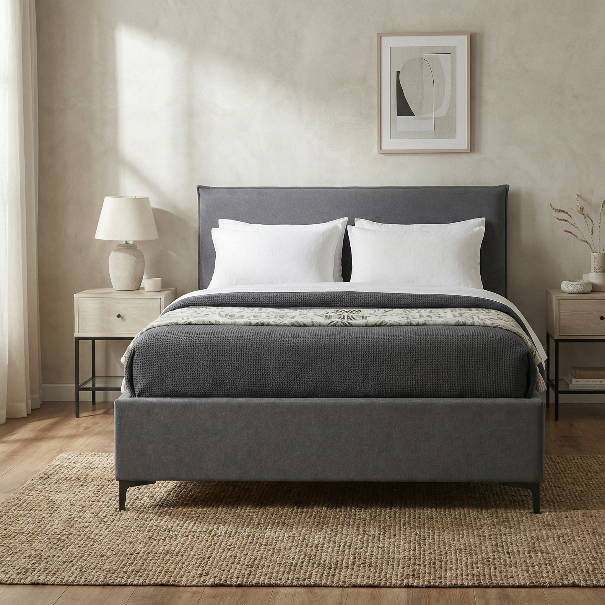 מיטה רחבה לנוער מרופדת בד רחיץ עם ארגז מצעים מעץ, בסיס עץ מלא ורגלי ברזל גבוהות לניקוי קל, בעיצוב מודרני בגוון אפור.