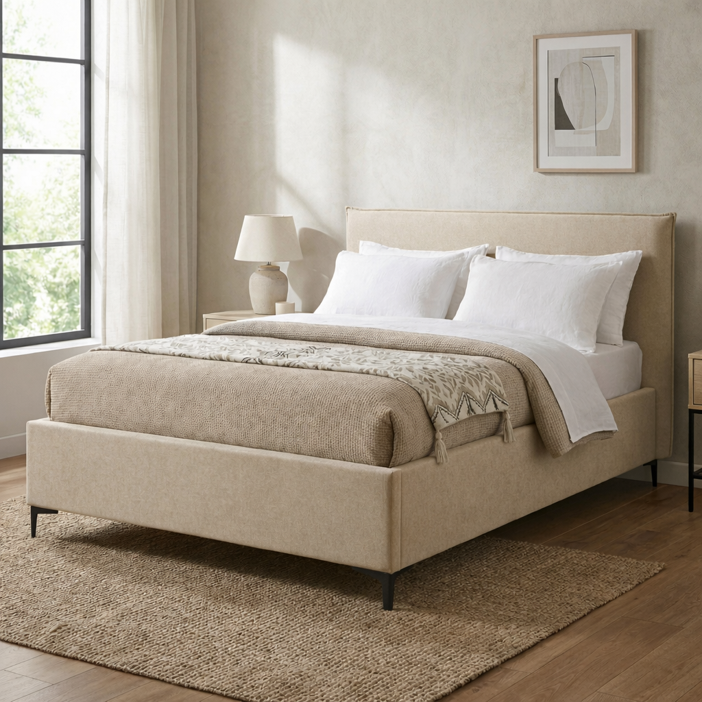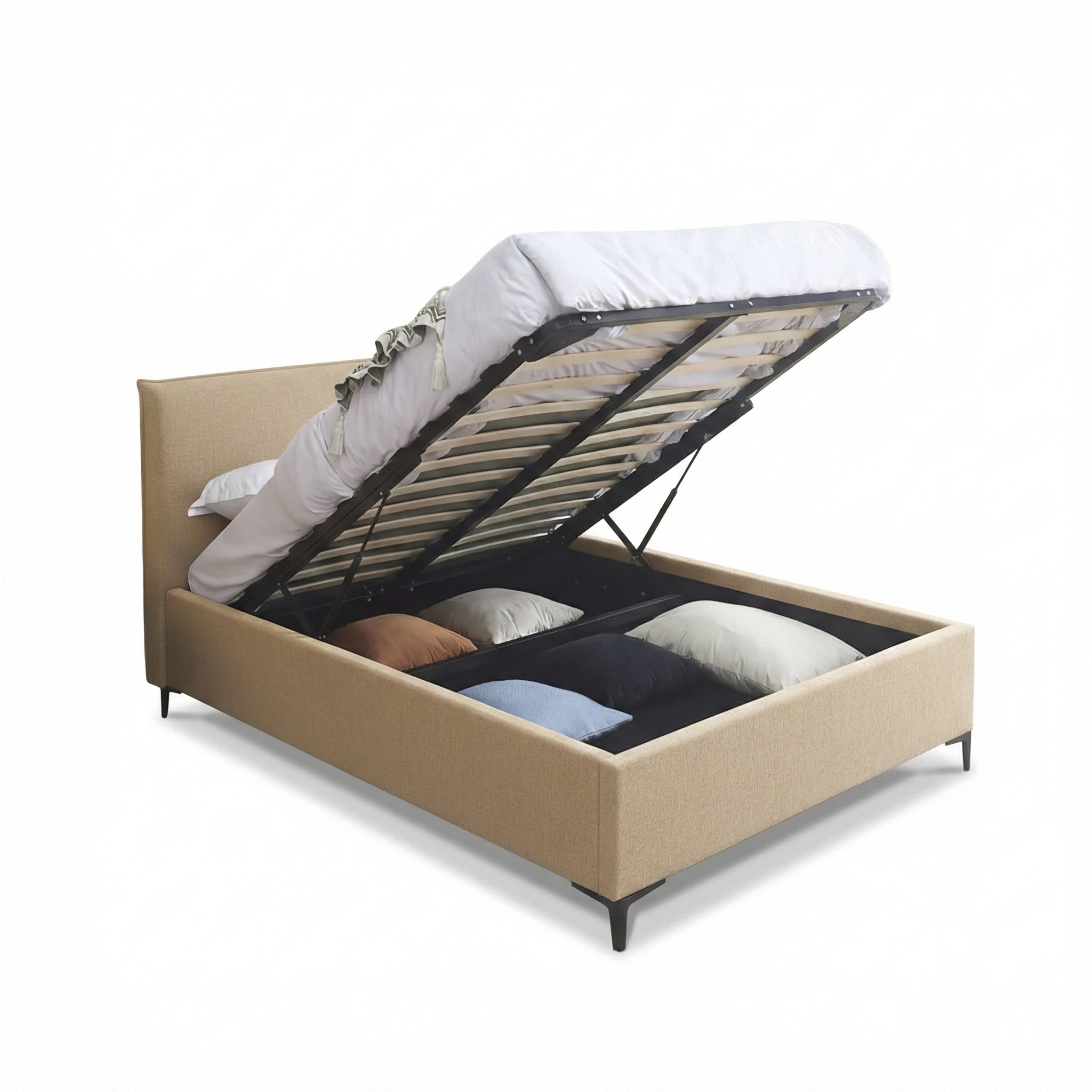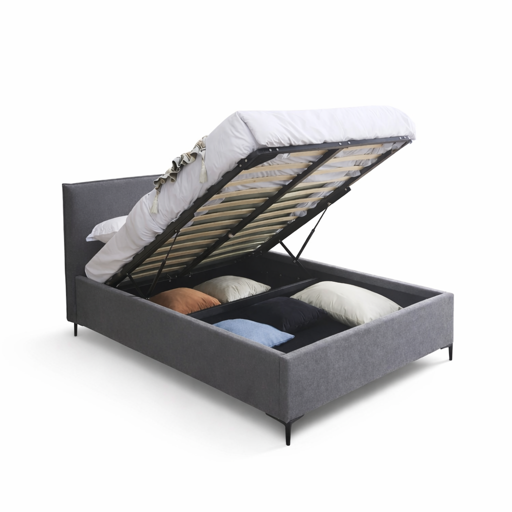 ארגז מצעים מובנה עם מנגנוני בוכנות להרמה קלה, רגלי ברזל גבוהות לניקוי מתחת למיטה.