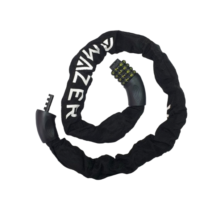 מנעול שרשרת לאופניים עם מנגנון נעילה בקוד לנוחות שימוש ללא מפתח. כולל ציפוי בד חיצוני להגנה על שלדת האופניים מפני שריטות ומתאים לשימוש יומיומי.