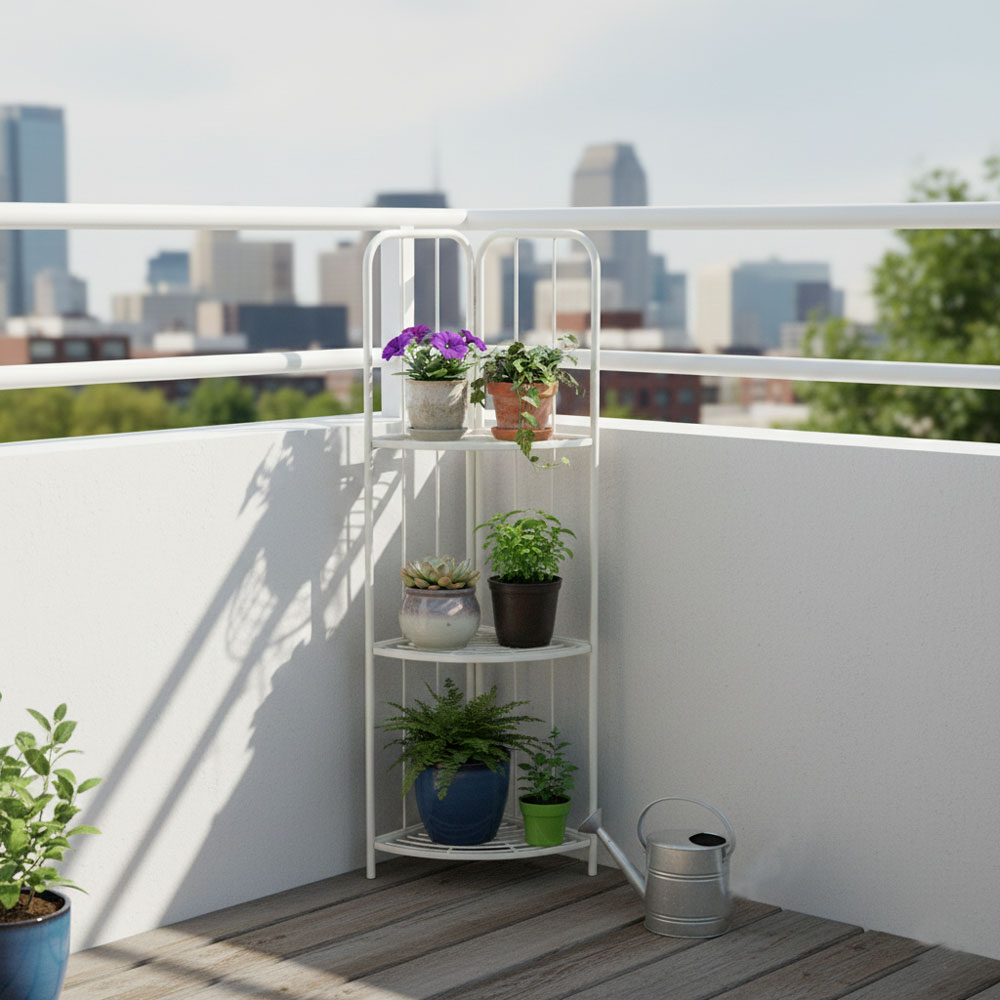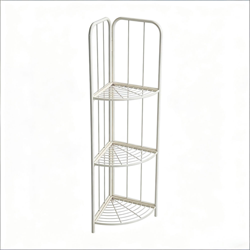 מעמד פינתי דקורטיבי לעציצים עם 3 קומות, עשוי ברזל חזק ועמיד בגימור קרם אלגנטי, מושלם לארגון והצגת עציצים בפינת חדר, מרפסת או חלל חוץ מקורה.