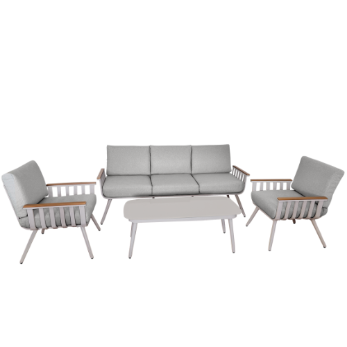 פינת ישיבה מפנקת לגינה או למרפסת, בעלת עיצוב מודרני חדשני ונוחות מרבית, שלדת אלומניום איכותי בשילוב עץ למראה קלאסי ב-3 גוונים מרהיבים לבחירה. הסט כולל 2 כורסאות יחיד, ספה תלת מושבית ושולחן רחב עם זכוכית מחוסמת.