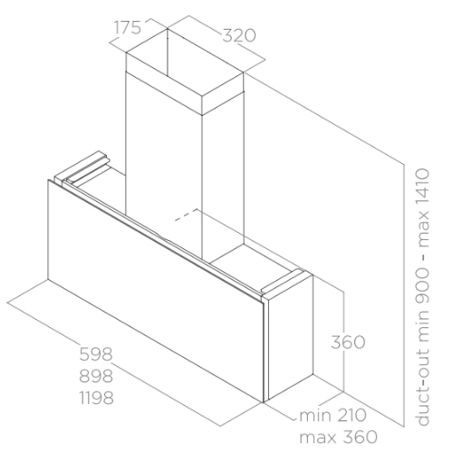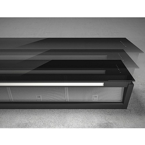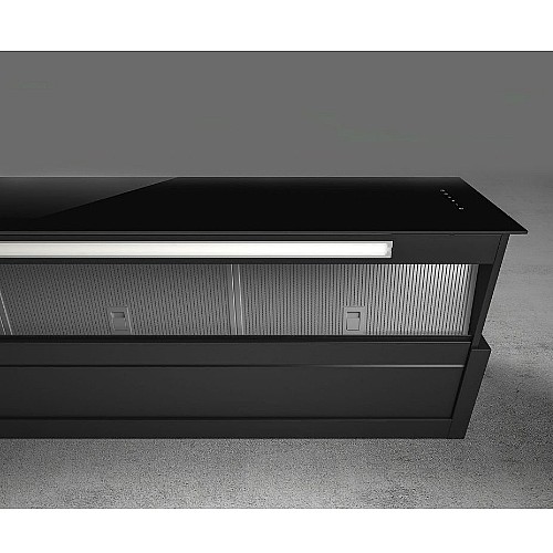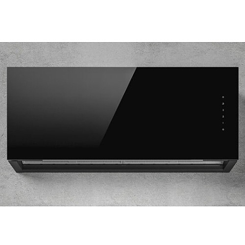 קולט אדים צמוד קיר איכותי, רוחב 90 ס”מ, בעל גימור זכוכית שחורה, גרסאות סגנון סחרור פנימי/חיצוני לפי בחירה, בקרי מגע, תאורת Strip LED 1X7W ועוצמת יניקה מקסימלית עד 900 מק"ש.