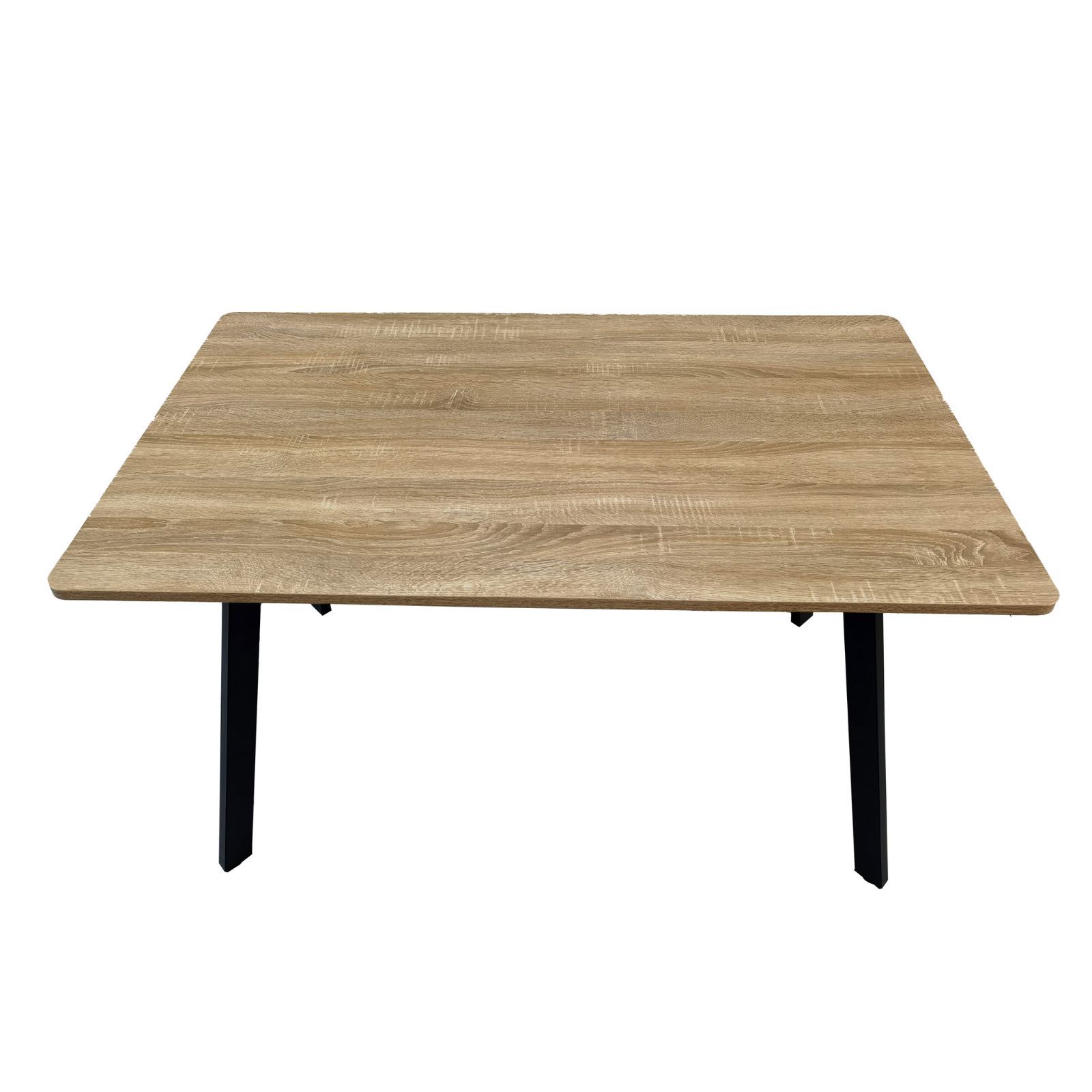 שולחן אוכל בעיצוב מינימליסטי עם פלטת MDF בציפוי מלמין בגוון עץ טבעי ורגלי מתכת שחורות, מתאים למטבח, פינת אוכל קטנה או כפינת עבודה ביתית.