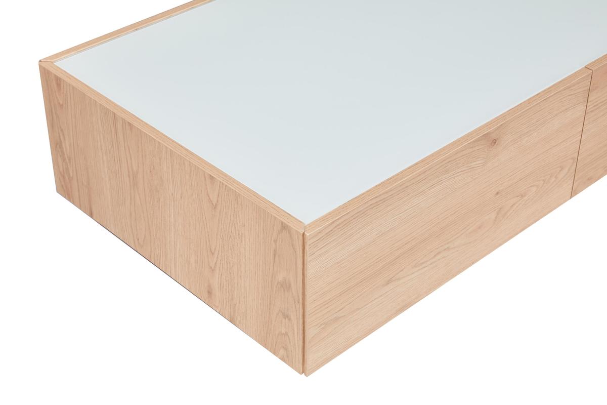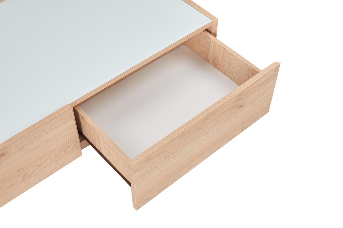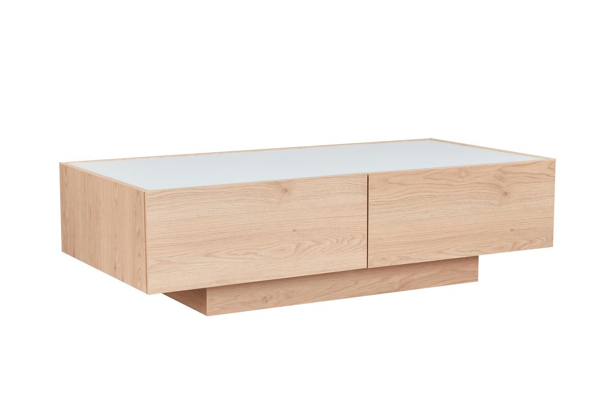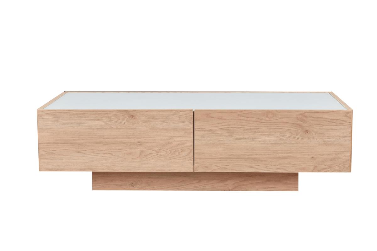 שולחן סלון בעיצוב מודרני בגוון אלון בשילוב לבן הכולל שתי מגירות אחסון מרווחות ומשטח תחתון ליציבות גבוהה. פתרון פרקטי לשמירה על סדר ונוחות שימוש בסלון.