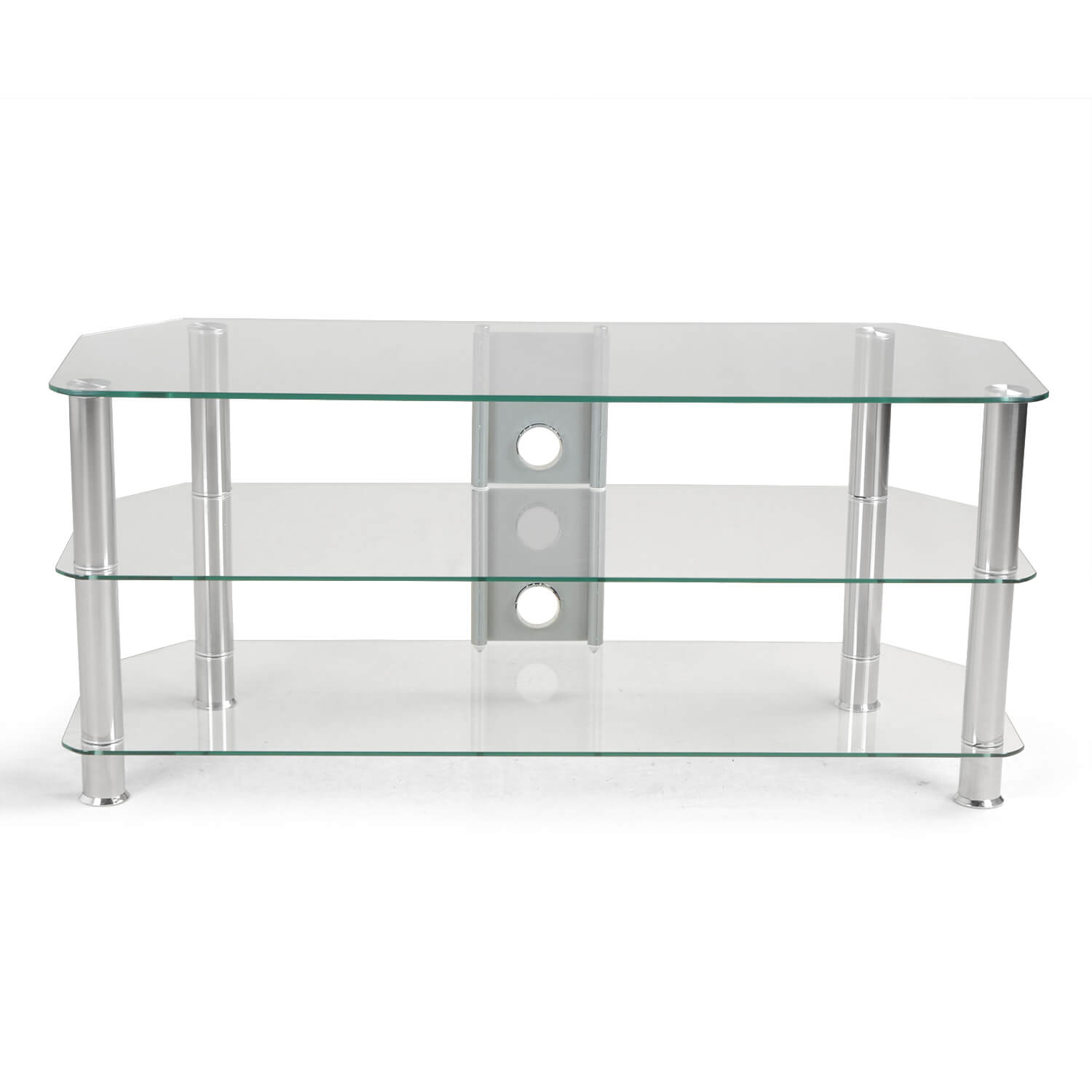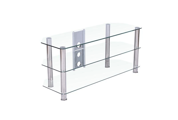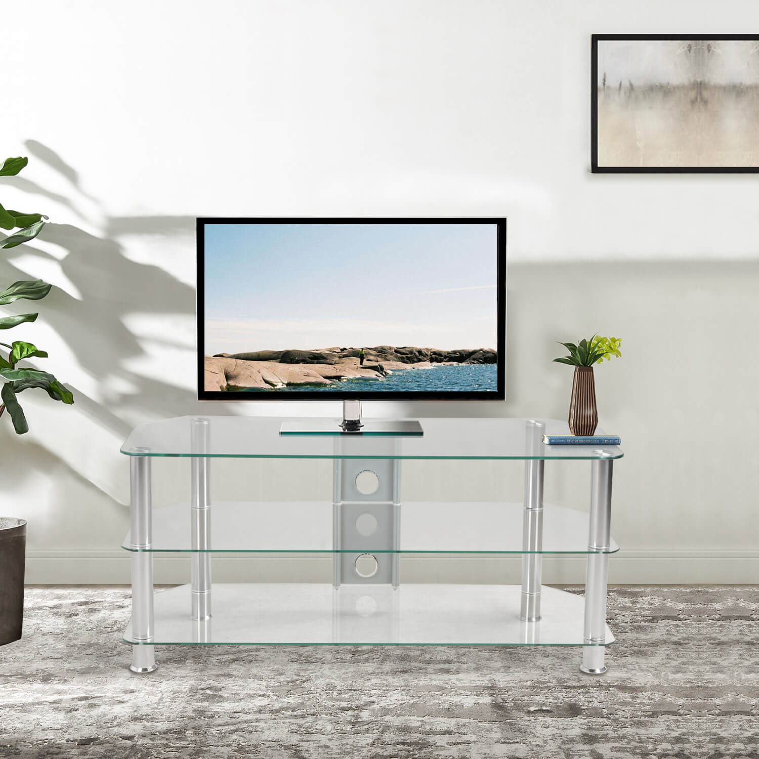 שידת טלוויזיה בעלת שלושה מדפים מזכוכית שקופה
