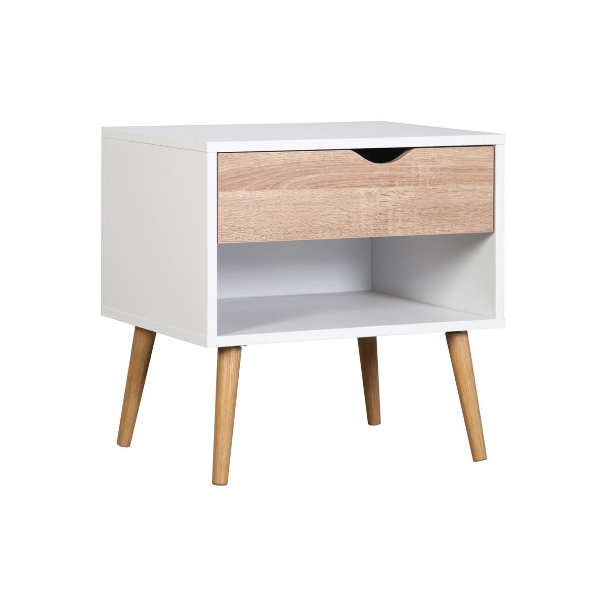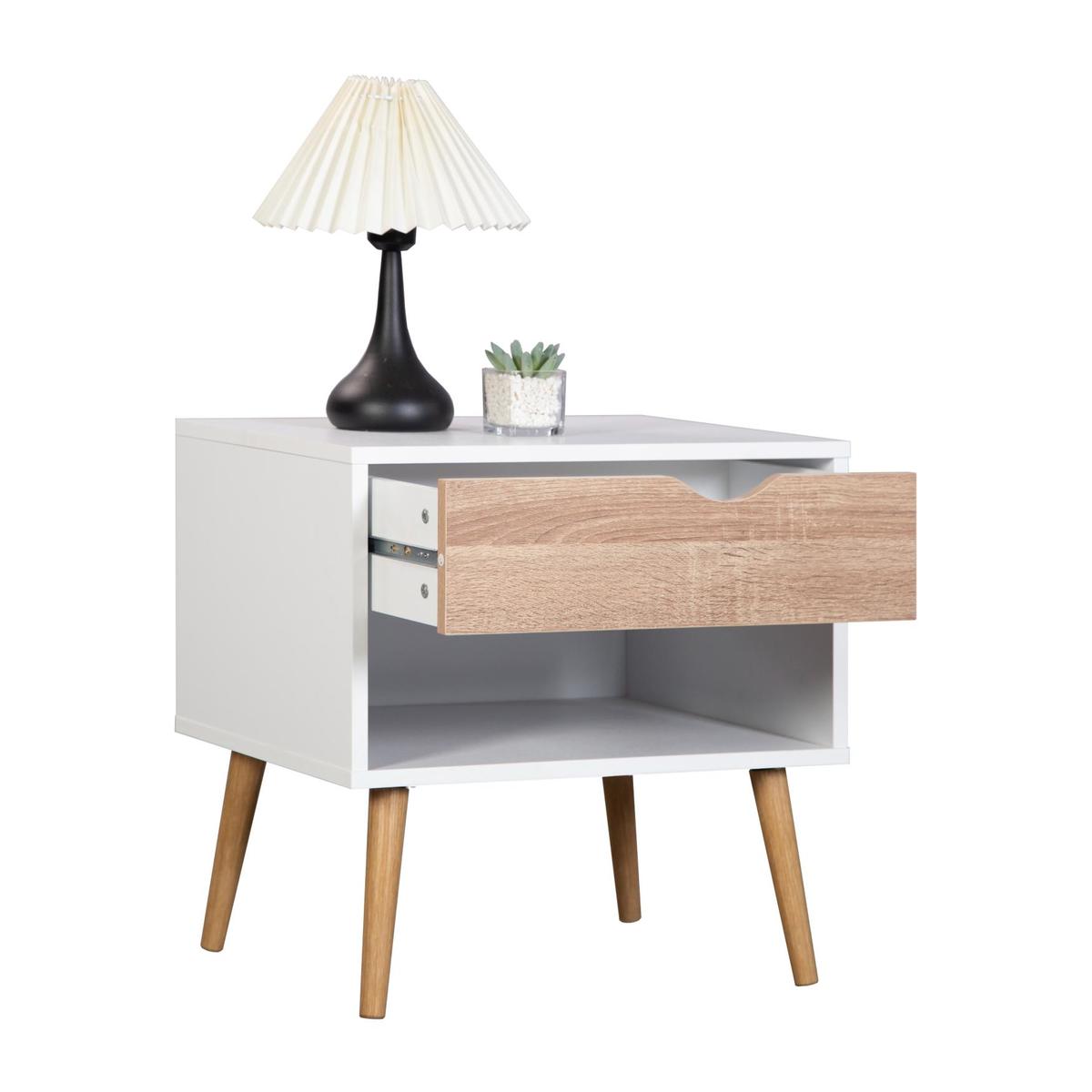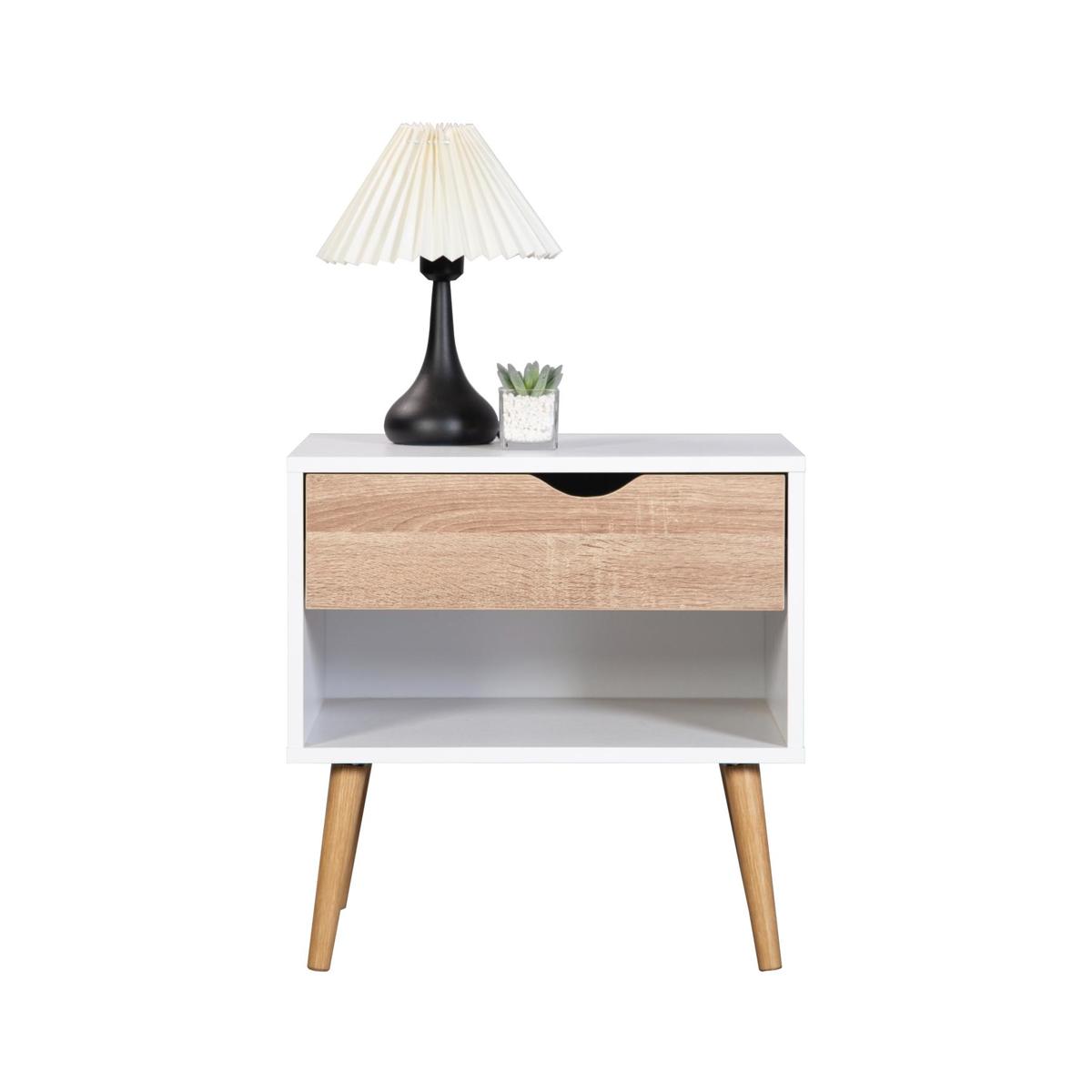 שידת לילה בעיצוב מודרני בגוון לבן בשילוב אלון בהיר הכוללת מגירה ומדף אחסון פתוח. פתרון פרקטי ונוח לשמירה על סדר לצד המיטה בחדר השינה.