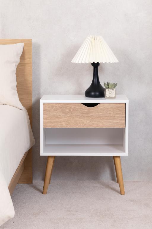 השידה משלבת גוון לבן עם אלון בהיר ליצירת מראה חמים ואלגנטי לצד המיטה.
