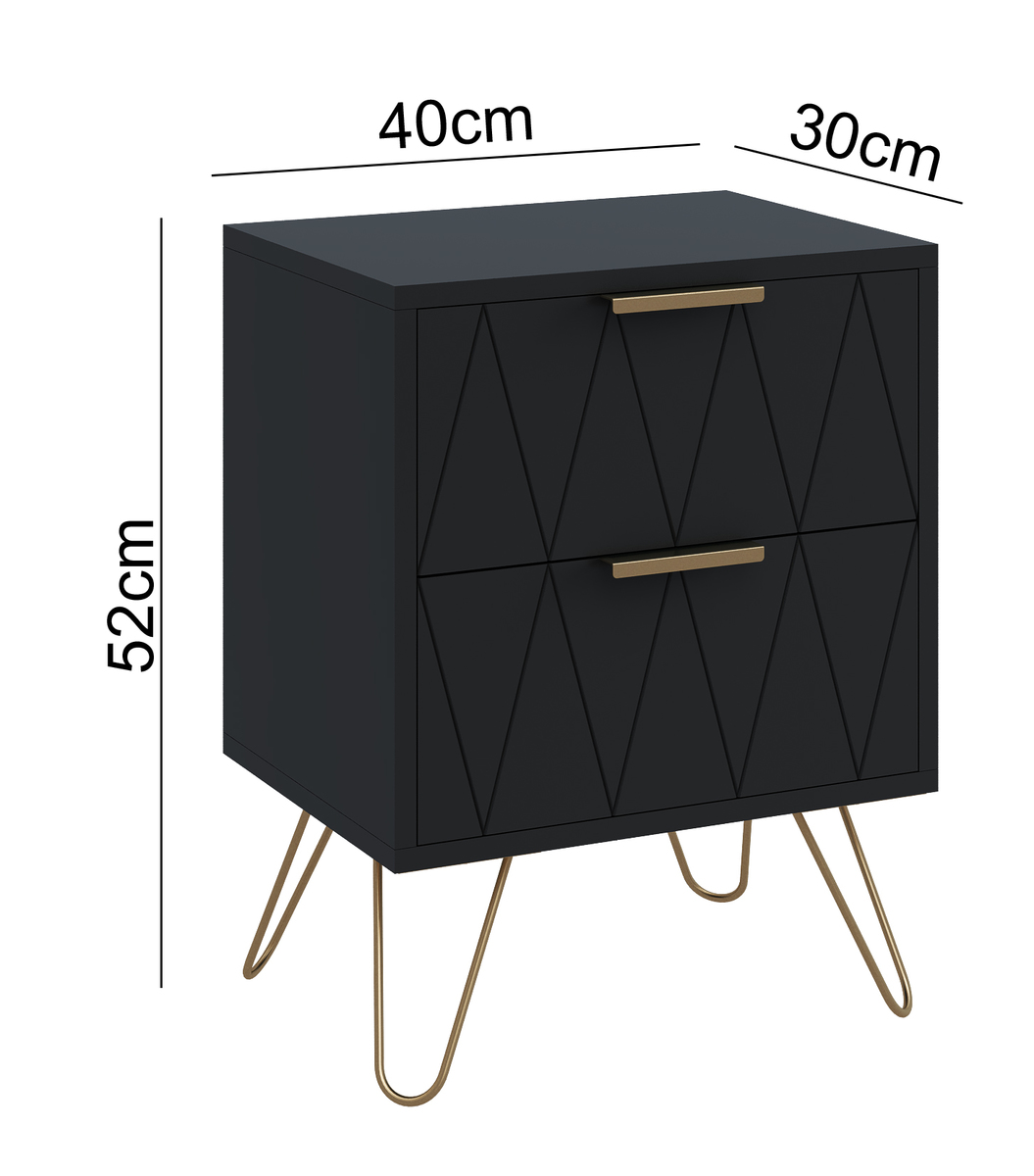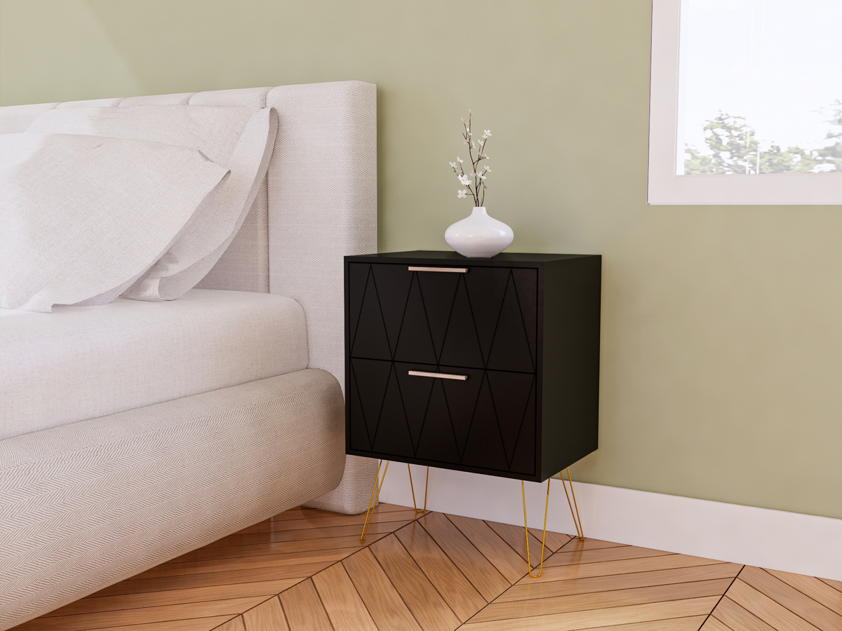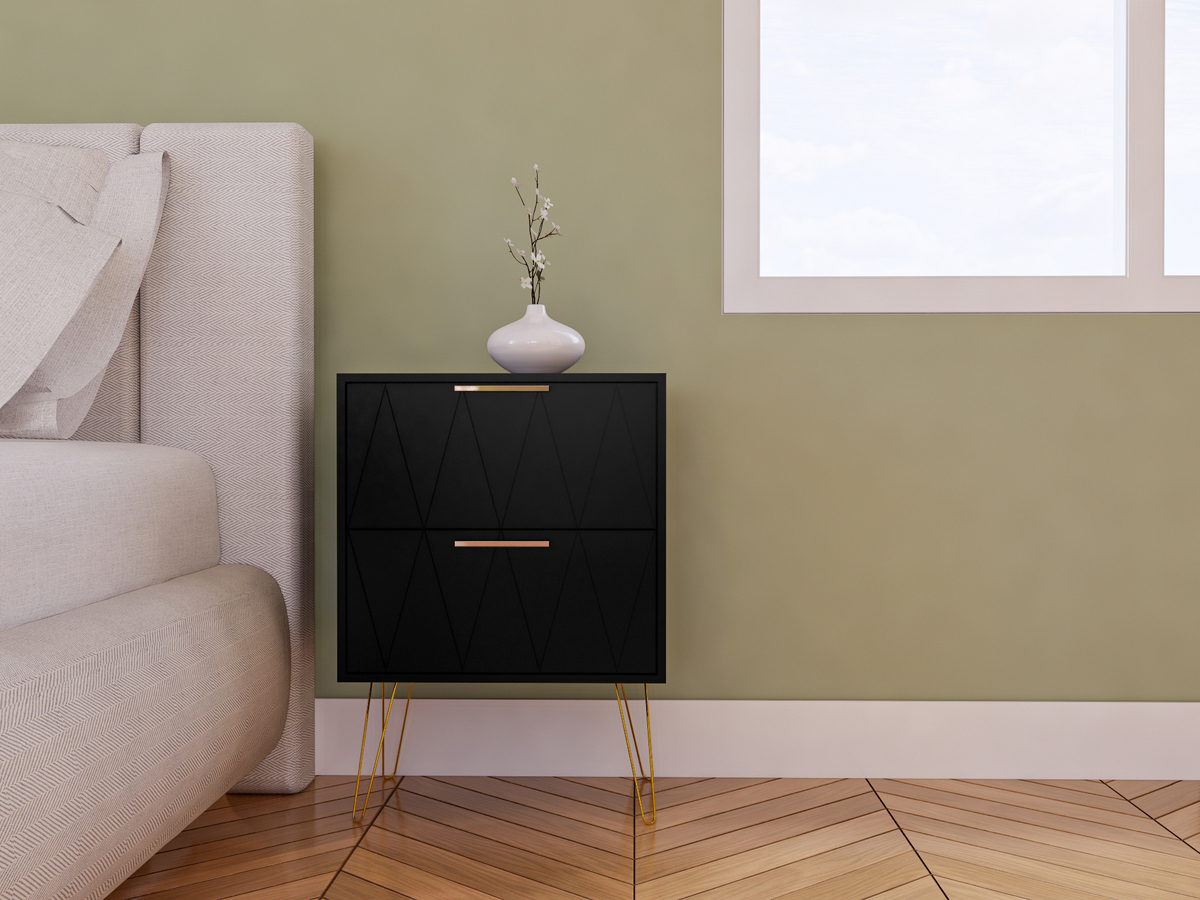 שידת לילה בעיצוב מודרני בגוון שחור בשילוב פרטי זהב המעניקים מראה אלגנטי לחדר השינה. כוללת שתי מגירות אחסון נוחות לשמירה על סדר לצד המיטה.