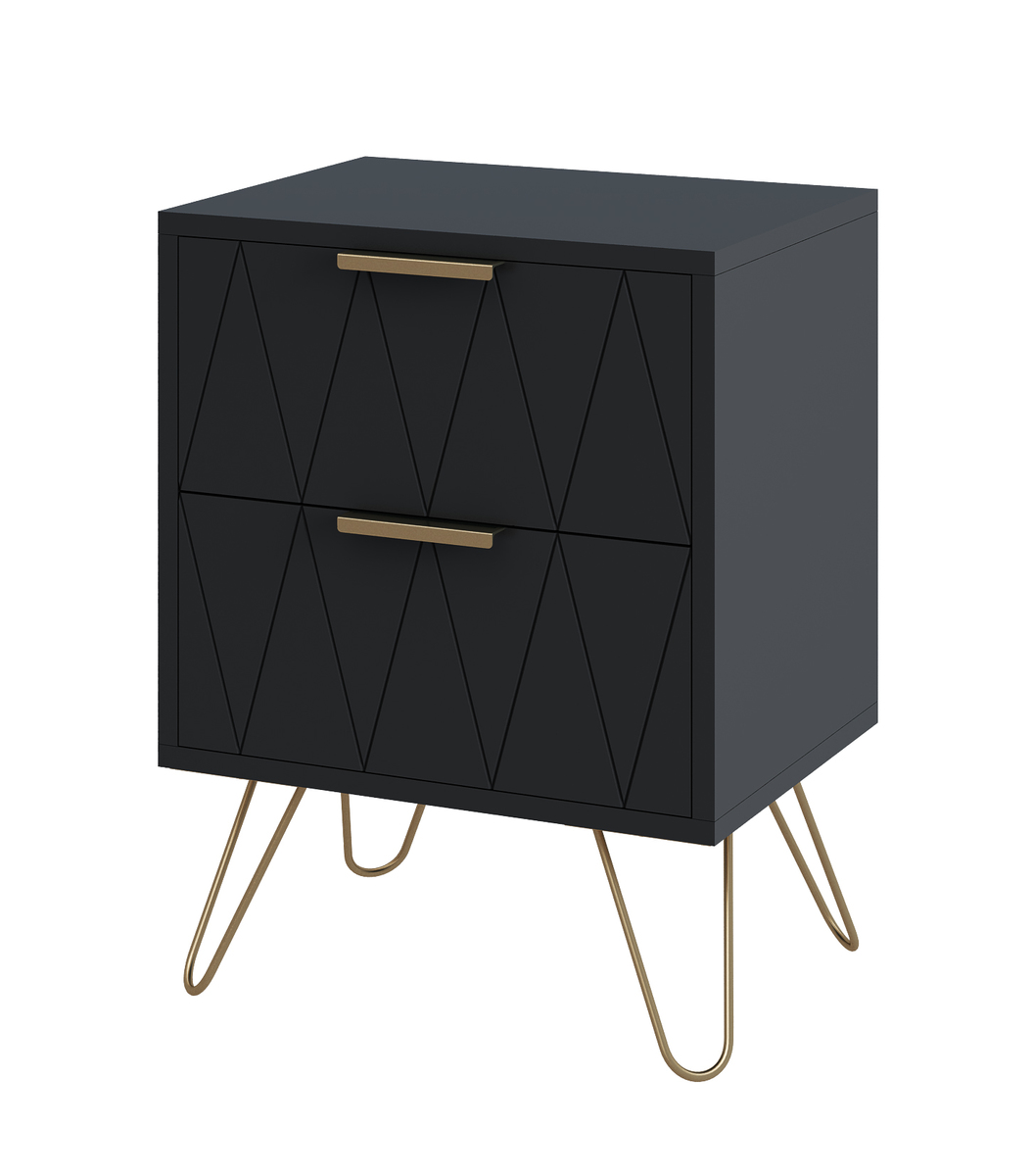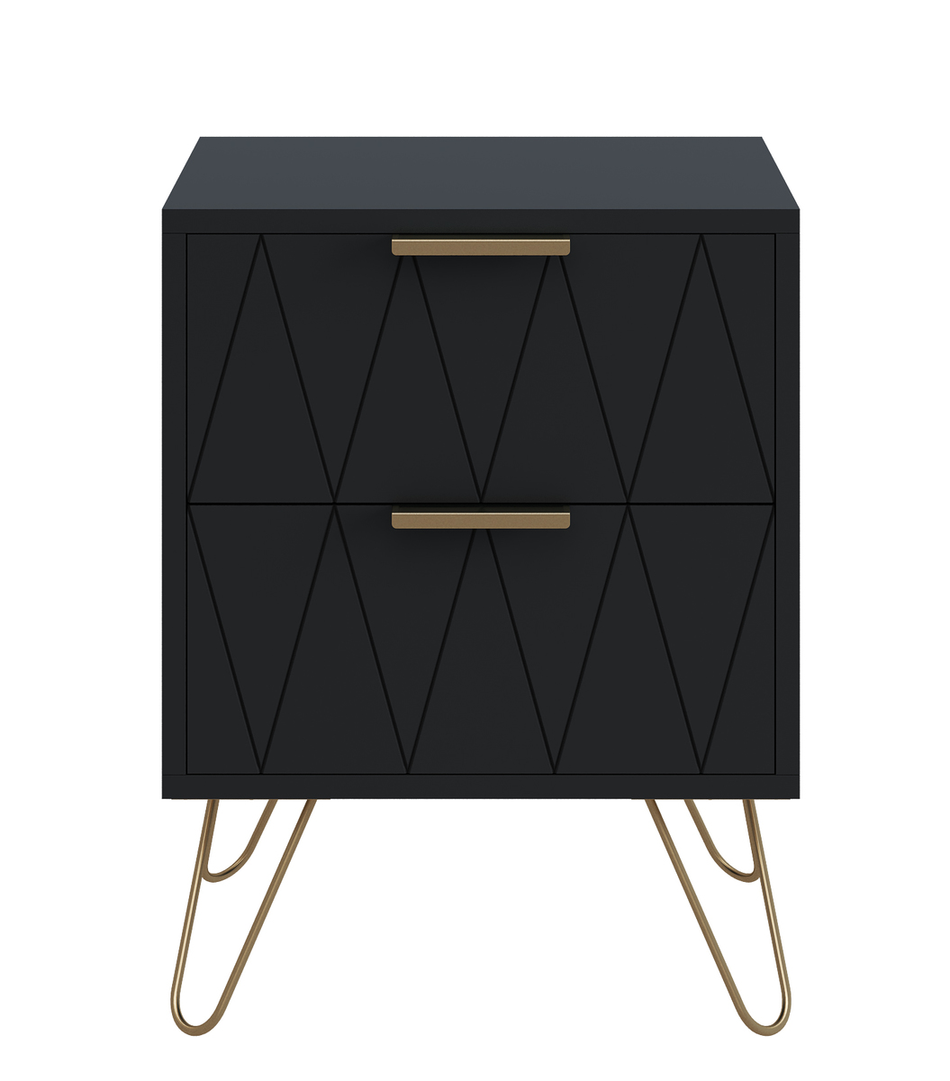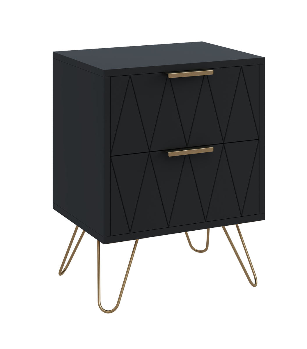 שידת לילה בעיצוב מודרני בגוון שחור בשילוב פרטי זהב המעניקים מראה אלגנטי לחדר השינה. כוללת שתי מגירות אחסון נוחות לשמירה על סדר לצד המיטה.
